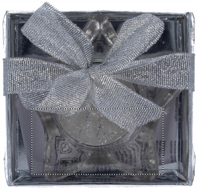 Star shaped glass tea light candle holder in silver box with transparent cover and decorative ribbon. Tea light included.