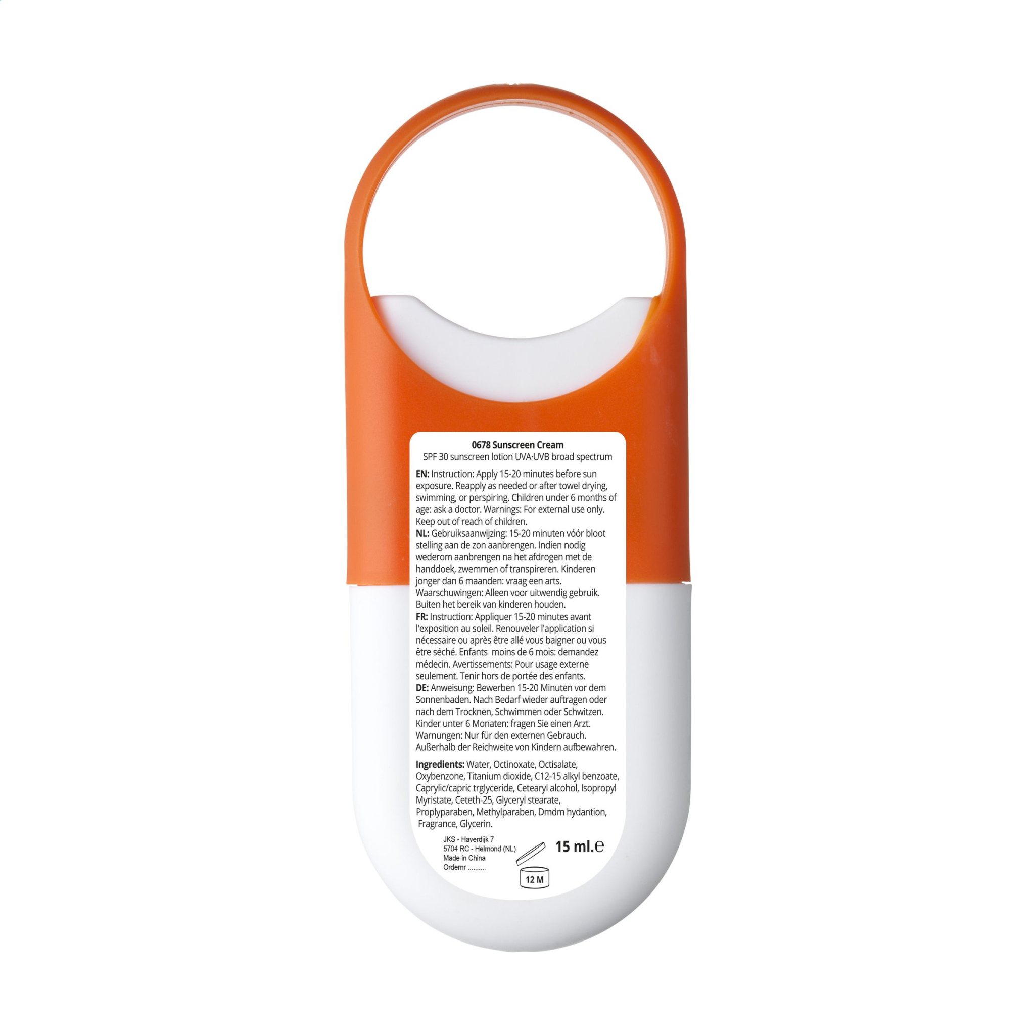 Protective sunscreen lotion (factor 30) in a handy plastic spray stick with vaporizer and large hanging eye. Best before: 12 months after opening. Contents 15 ml. Ingredients: aqua, Octinoxate, Octisalate, Oxybenzone, Titanium dioxide, C12-15 alkyl benzoate, Caprylic/capric triglyceride, Cetearyl alcohol, Isopropyl Myristate, Ceteth-25, Glyceryl stearate, Proplyparaben, Methylparaben, Dmdm hydantoin, Fragrance, Glycerin.