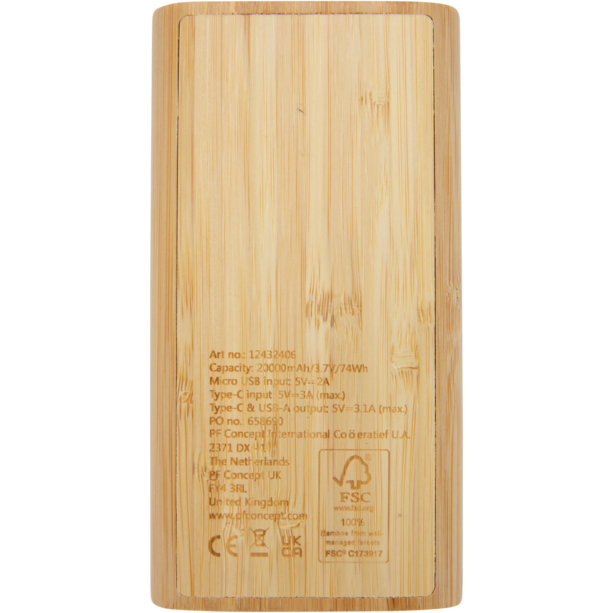 20.000 mAh power bank made from bamboo, featuring an ON/OFF touch button and 4 LED indicators to show the remaining battery capacity. Micro USB input 5V/2A, Type-C input 5V/3A, Type-C output 5V/3.1A max, dual USB-A output 5V/3.1A max, total power 15.5W. Delivered with a 30 cm TPE 3A Type-C to Type-C charging cable, an instruction manual and a kraft paper gift box. Since bamboo is a natural product, there may be slight variations in colour and size per item, which may affect the final printing outcome.