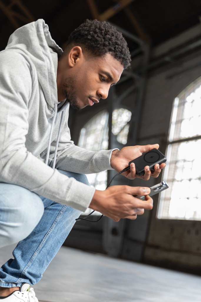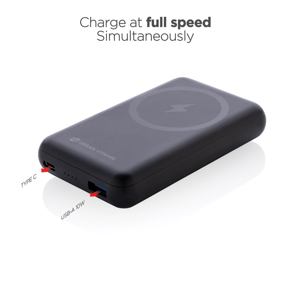 Charge your phone up to 2.5 times with this fast charging powerbank. The slim and compact powerbank has an integrated fast 10W wireless magnetic charger. Features a versatile built-in foldable kickstand that keeps your phone upright for a comfortable viewing angle. Thanks to the ultra fast type C PD port, the powerbank re-charges in record time. Charging your phone up to 50% takes only 30 minutes. Slow charging is something from the past. The powerbank contains a long lasting A-grade 10.000 mah battery to charge all your devices on your travels and adventures. The double output A and type C port allow you to charge up to 2 devices at the same time. Made with RCS (Recycled Claim Standard) certified recycled ABS Total recycled content: 16 % based on total item weight. RCS certification ensures a completely certified supply chain of the recycled materials. Urban Vitamin items are made without PVC and packed in plastic reduced packaging. USB :5V 3.0A Type C : 5V 3.0A,9V 2.22A, 12V 1.5A .