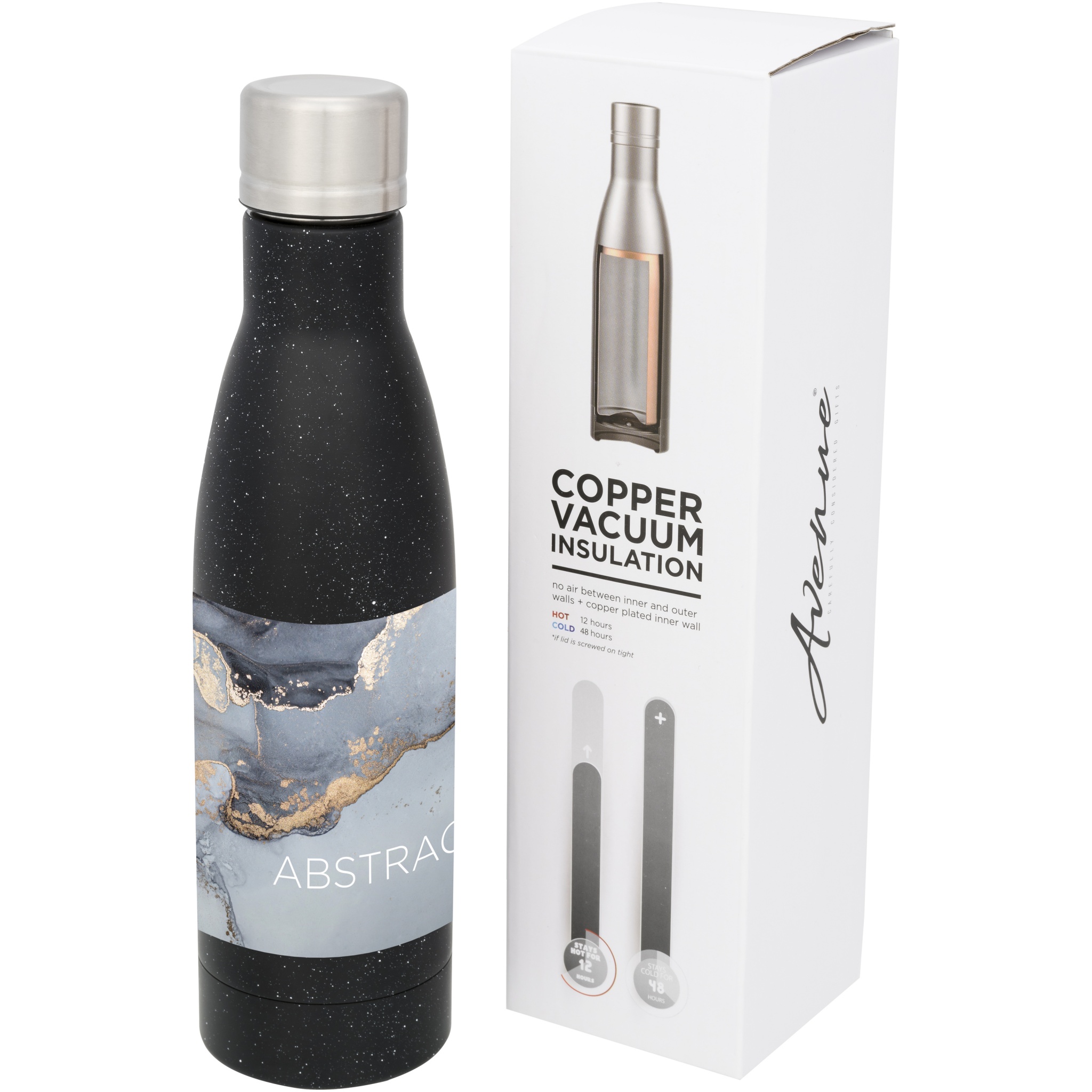 Keep your drinks hot for 12 hours or cold for 48 hours with the Vasa speckled copper vacuum insulated bottle. Double walled and made from stainless steel with vacuum insulation and a copper plated inner wall, which means that your beverage is kept piping hot or ice cold depending on your requirements. The bottle features an on-trend, speckled finish. BPA Free and tested and approved under German Food Safe Legislation (LFGB), and for Phthalates Content under REACH. Volume capacity: 500 ml. Delivered in a gift box.