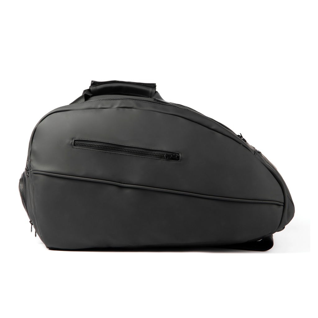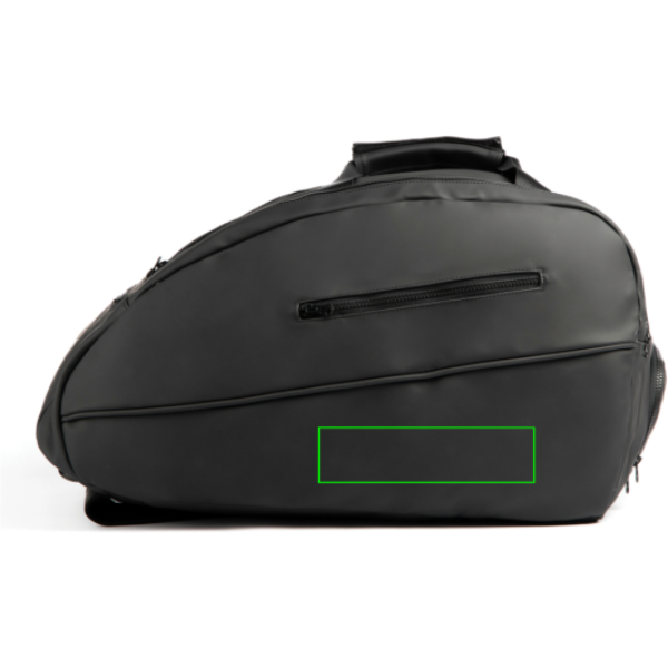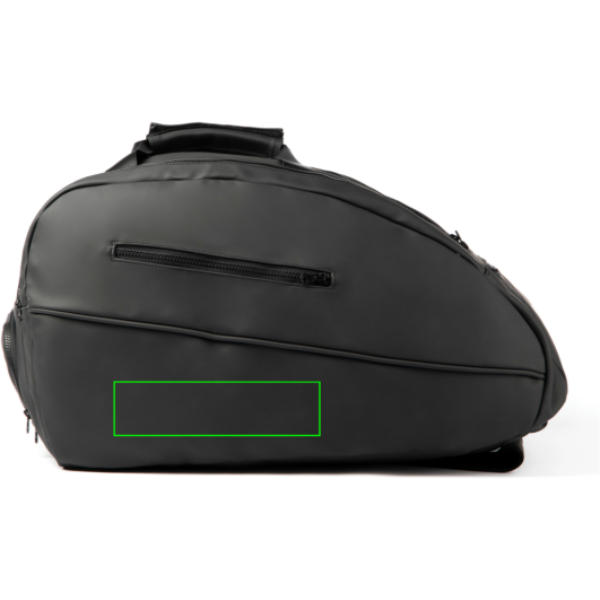 This backpack has a large main compartment and two side compartments for rackets. One short side has a separate compartment for shoes. Small, concealed zippered pockets for valuables. The main compartment has several pockets inside for balls or other items. This bag can be carried either as a backpack or as a sports bag. The backpack shoulder straps are padded for shoulder comfort and adjustable to ensure the perfect fit.