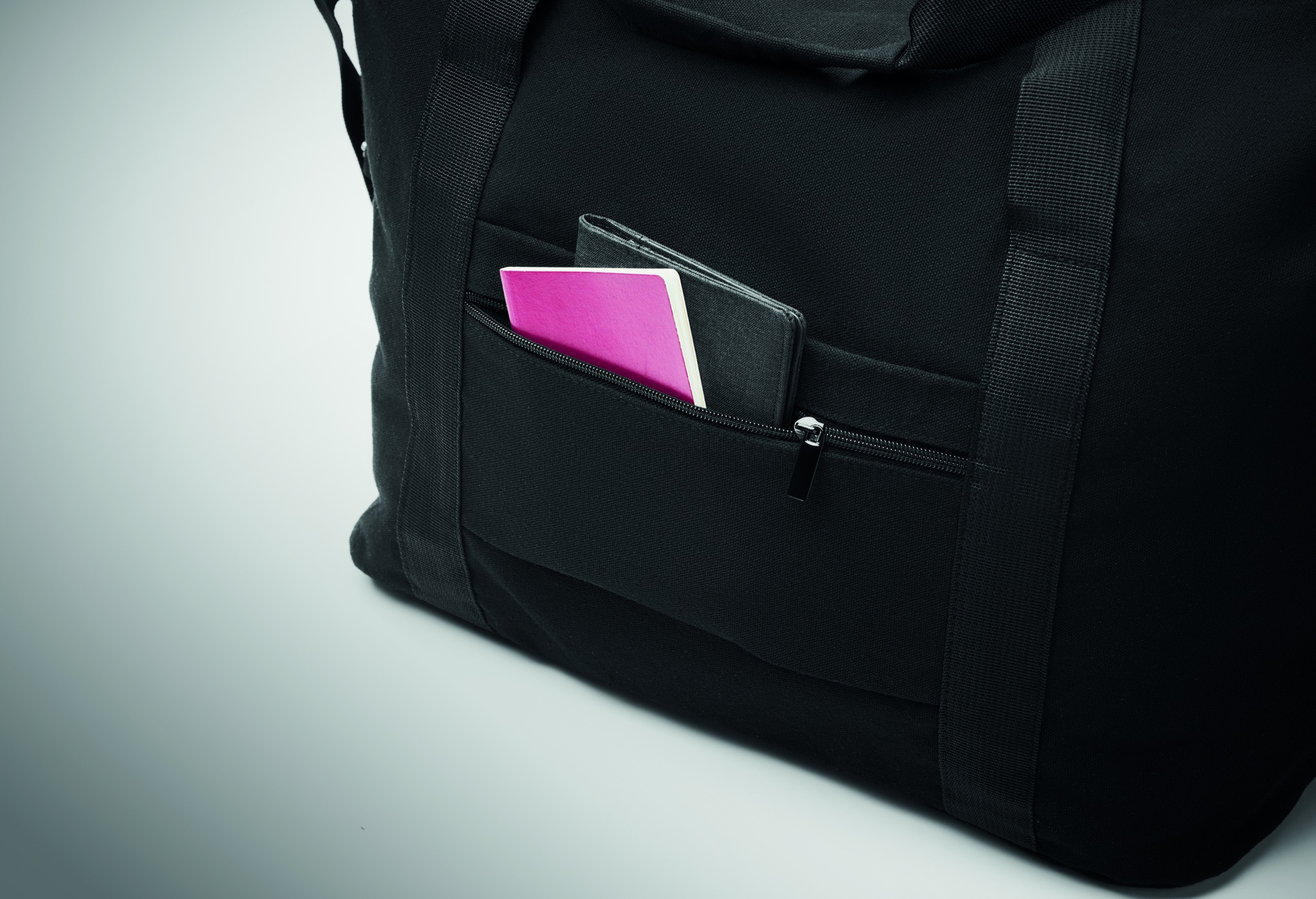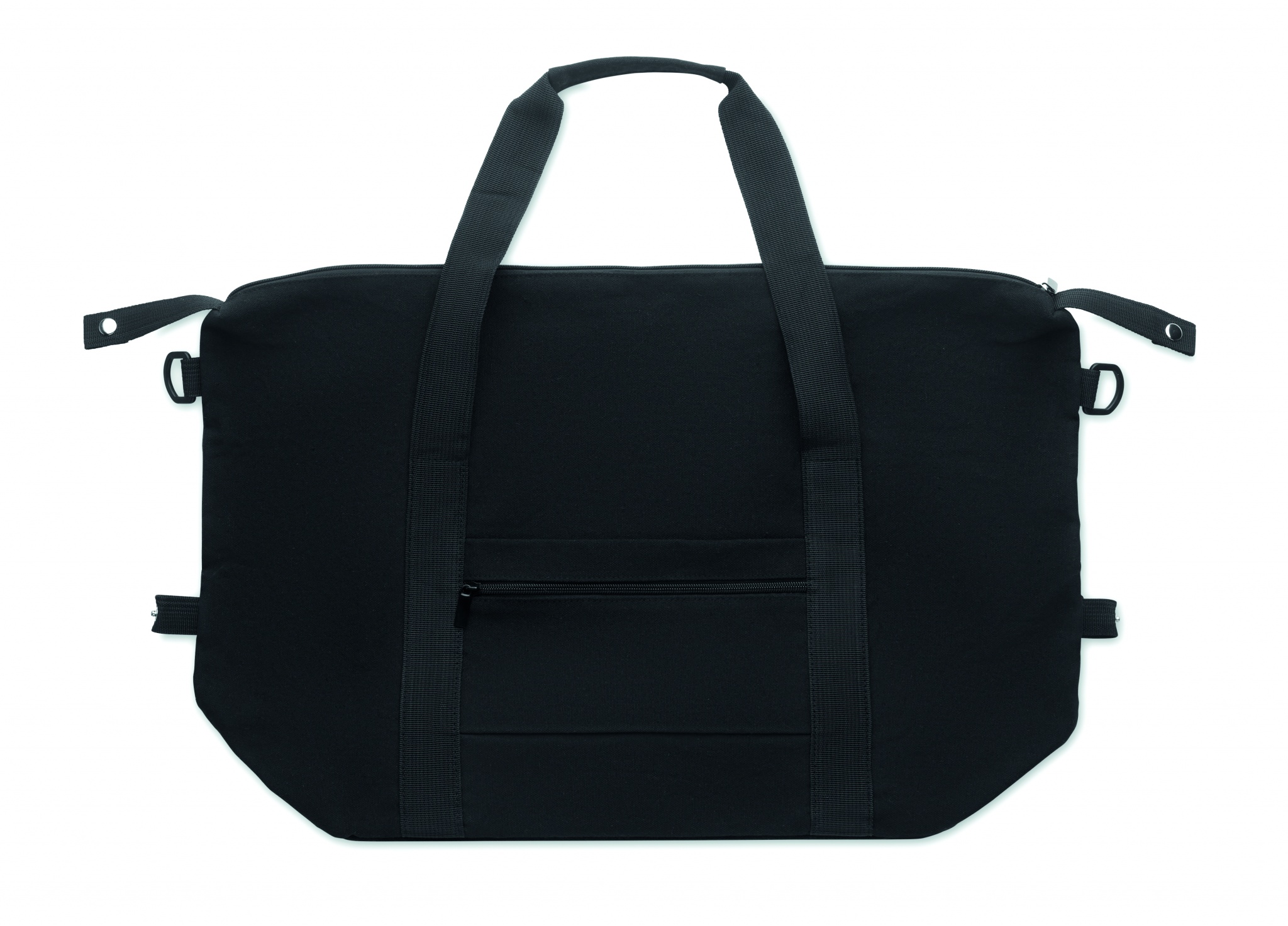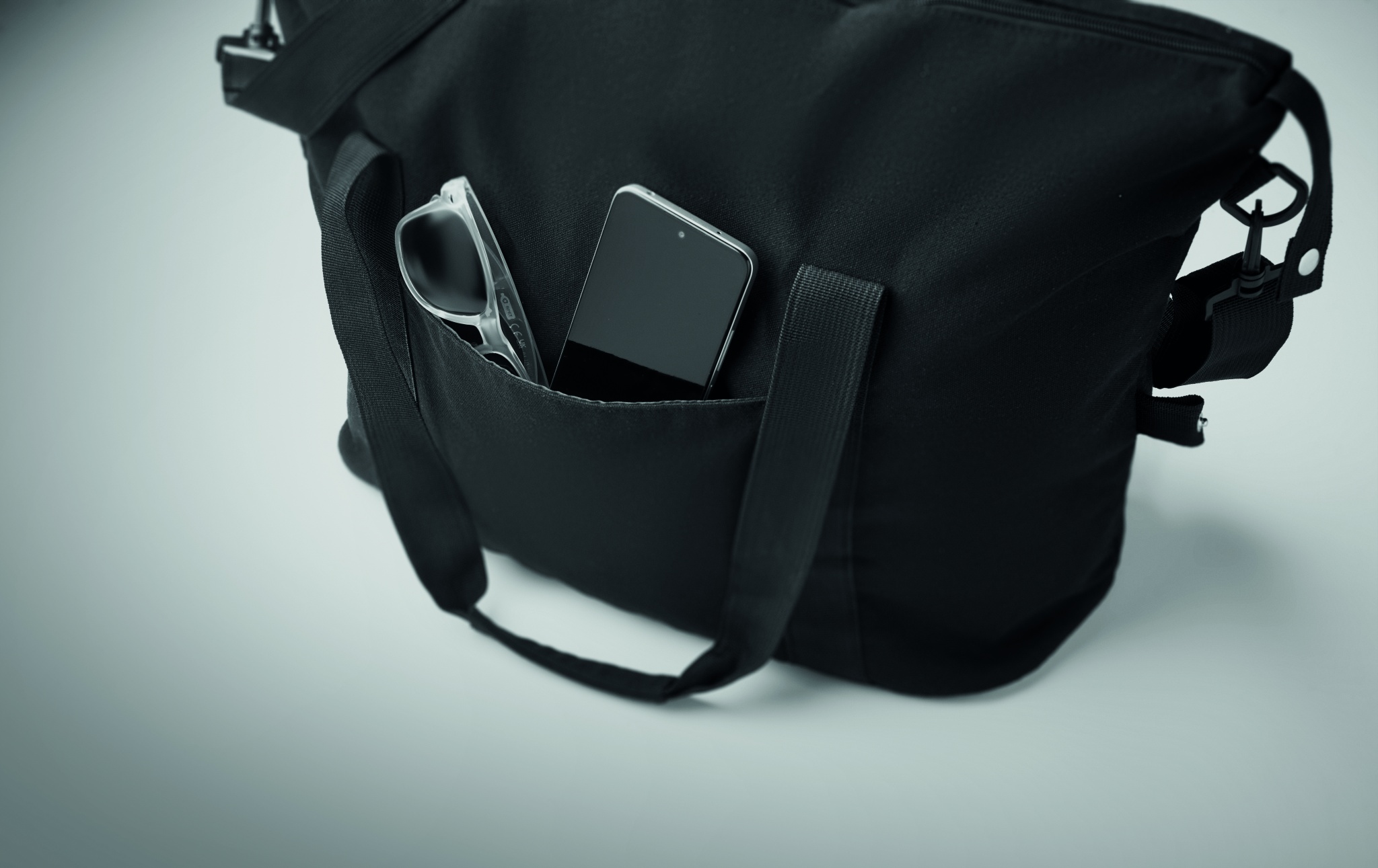 Weekend bag in recycled pre-consumer cotton and recycled polyester (70%/30%) with lining 210D RPET polyester. It has a front slip pocket, zippered back pocket a removable and adjustable shoulder strap and padded bottom. Trolley holder on reverse side.