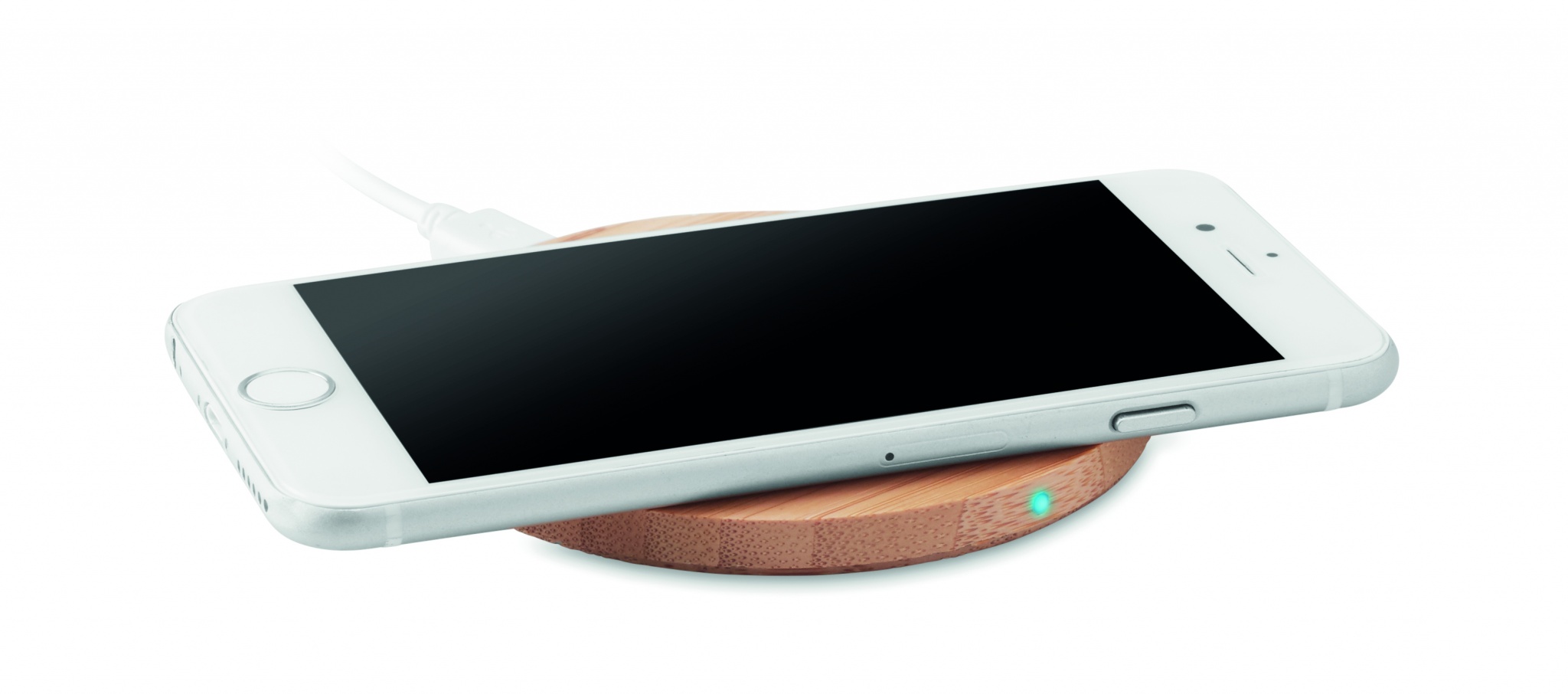 Wireless charger in bamboo. Connect device to your computer, place smartphone on it and allow it tocharge. Blue light lit when charging. Output: DC5V/1A (5W). Compatible with all QI enabled devices such as latest Androids, iPhone® 8, X and newer. Bamboo is a natural product, there may be slight variations in colour and size per item, which can affect the final decoration outcome.