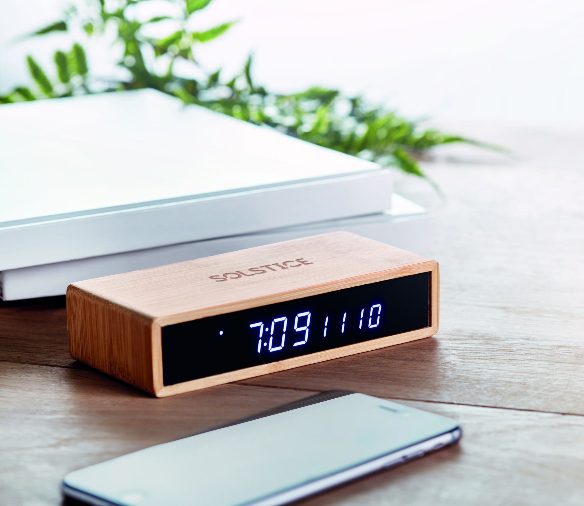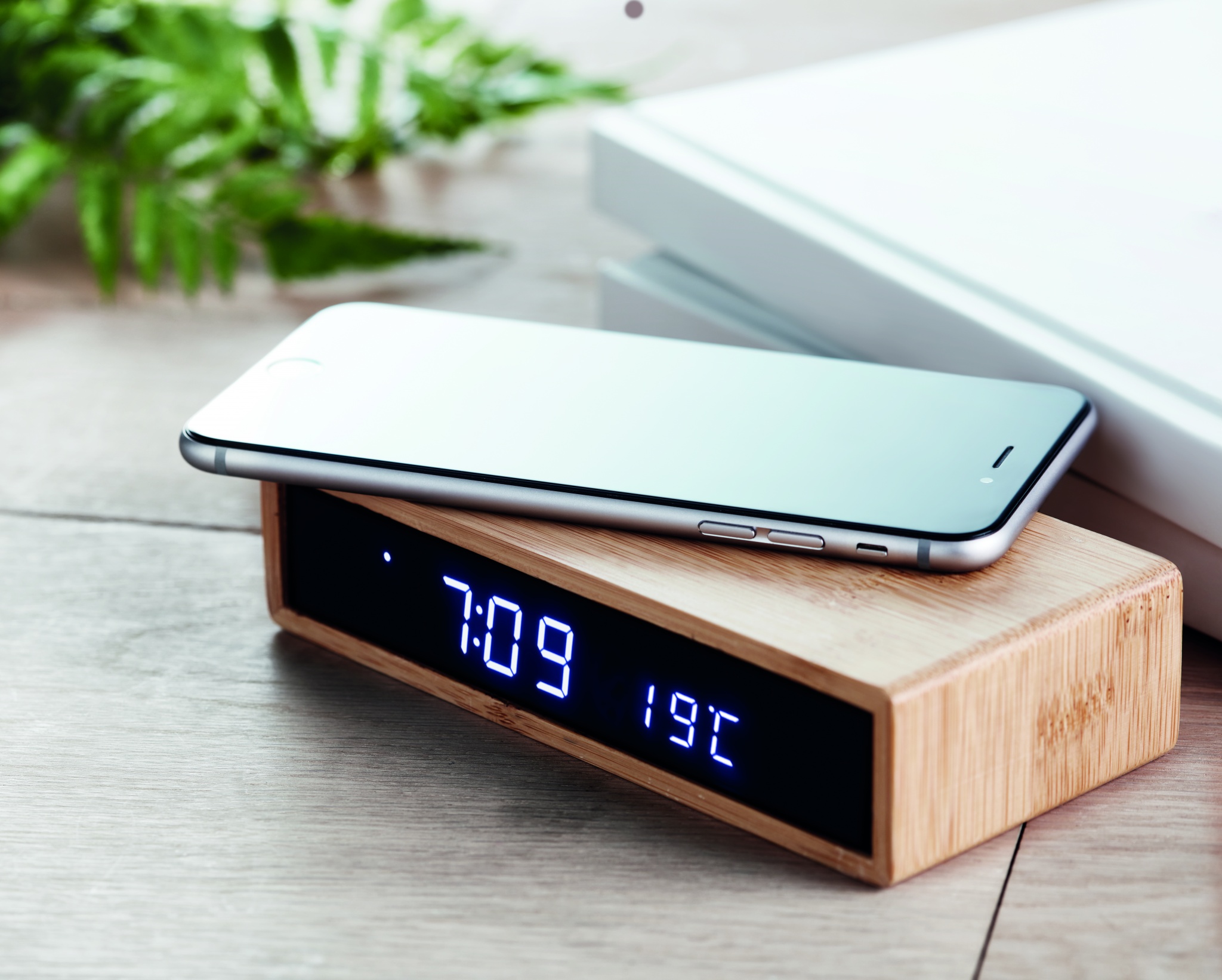 Wireless charger device including blue LED time display alarm clock and temperature in bamboo casing. AC-DC 2 pin plug adapter included. Wireless output: DC5V/1A (5W). Compatible latest androids, iPhone® 8, X and newer. Not suitable for UK use. Bamboo is a natural product, there may be slight variations in colour and size per item, which can affect the final decoration outcome.