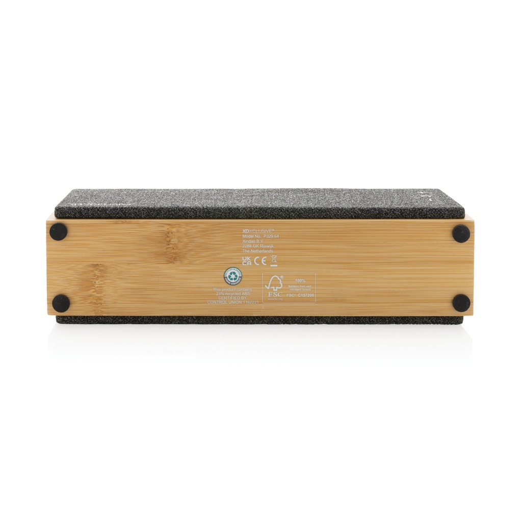 Luxury 10W speaker with clear sound and strong bass. The outer casing is made from FSC 100% certified bamboo. The plastic components are made with RCS (Recycled Claim Standard) certified recycled ABS. Total recycled content: 23 % based on total item weight. RCS certification ensures a completely certified supply chain of the recycled materials. The speaker comes with BT 5.1 for easy and smooth operation up to 10 metres and low power consumption. The 1200 mah battery allows a playtime up to 6 hours and can be fully re-charged in 2 hours. With pick up function and mic to answer (video) calls. Packed if FSC mix kraft box. Including RCS certified recycled TPE charging cable.