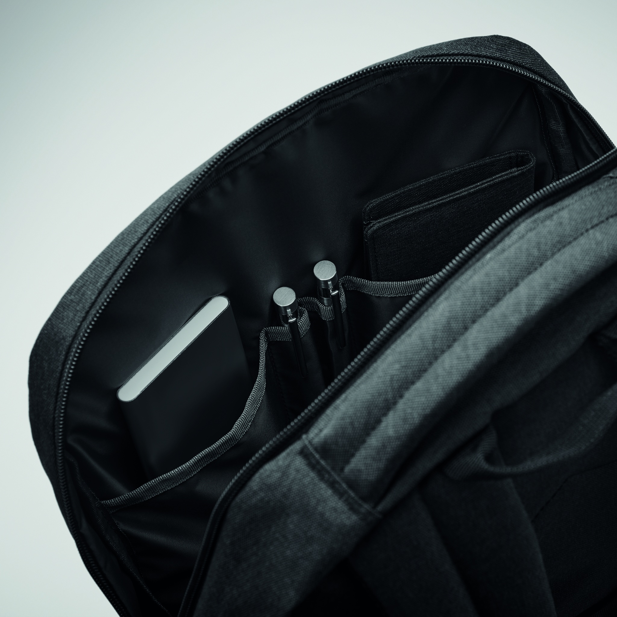 15-tolline sülearvuti seljakott 600D RPET polüestrist. Sisemine sülearvuti sahtel ja mitu väikest sisemist sahtlit. Sellel on lukuga eesmine tasku ja 2 külgmist võrktaskut. Reguleeritavad õlarihmad. Käru hoidik tagaküljel.