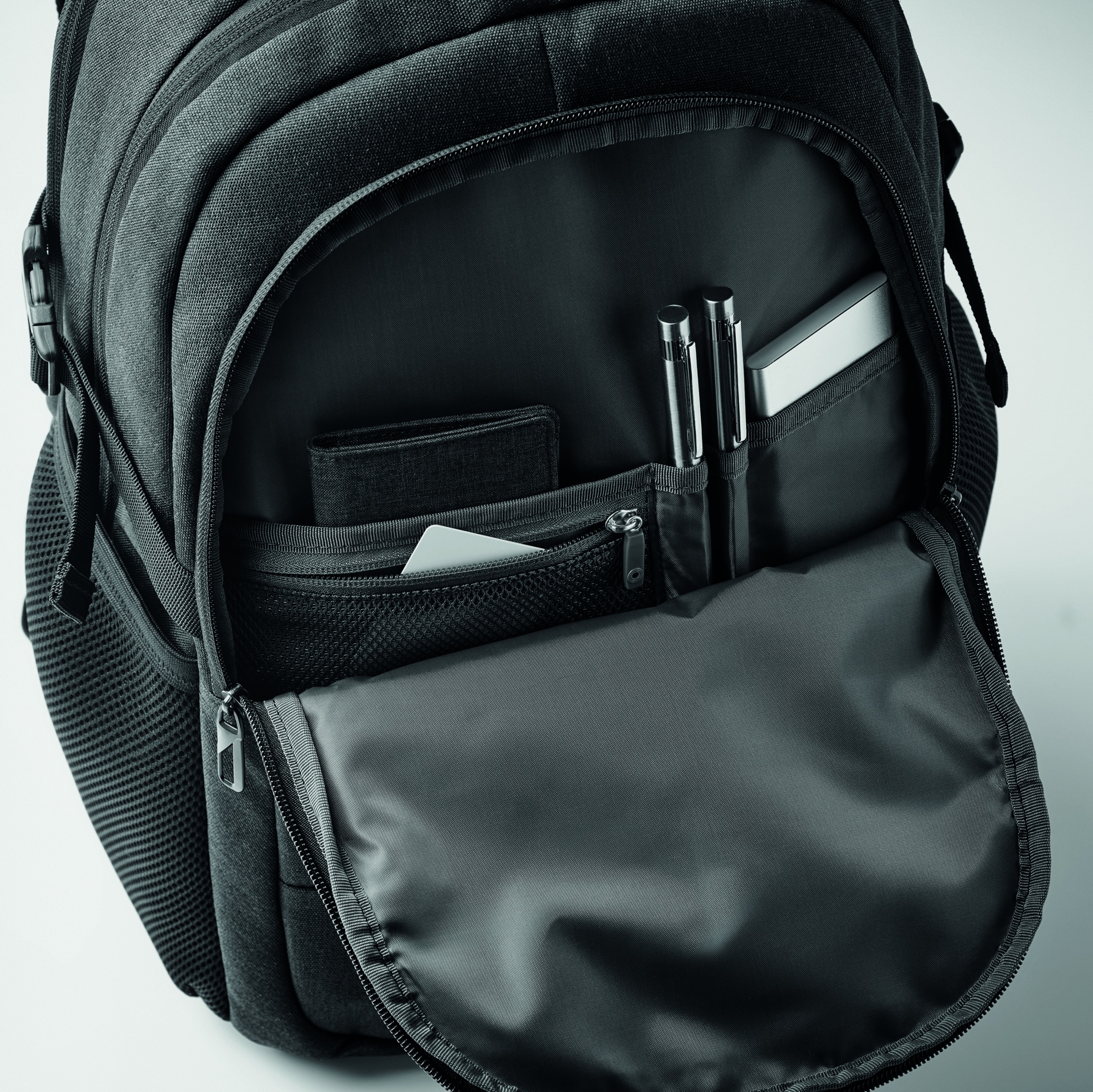 15-tolline sülearvuti seljakott 600D RPET polüestrist. 3 suurt lukuga välist sahtlit, mis on täielikult polsterdatud mitme sisetaskuga. Sellel on kaks võrgust küljetaskut. Reguleeritavad õlarihmad. Polsterdatud võrgust õhuvool ja käruhoidik tagaküljel.