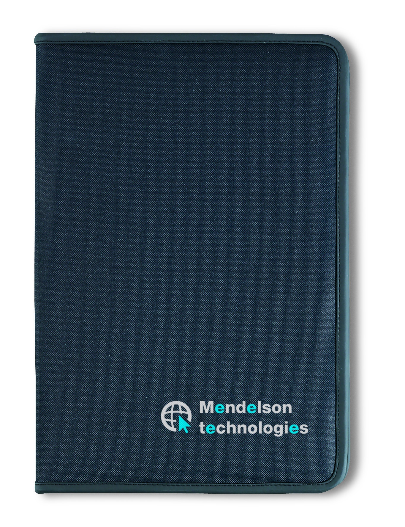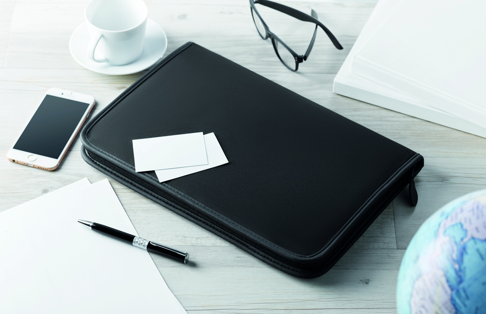 A4 konverentsimapp. 600D polüester ja 210T vooder. Tõmblukuga. A4 20 joonelise lehe märkmik. 4 sektsiooni. Kaardi auk.
