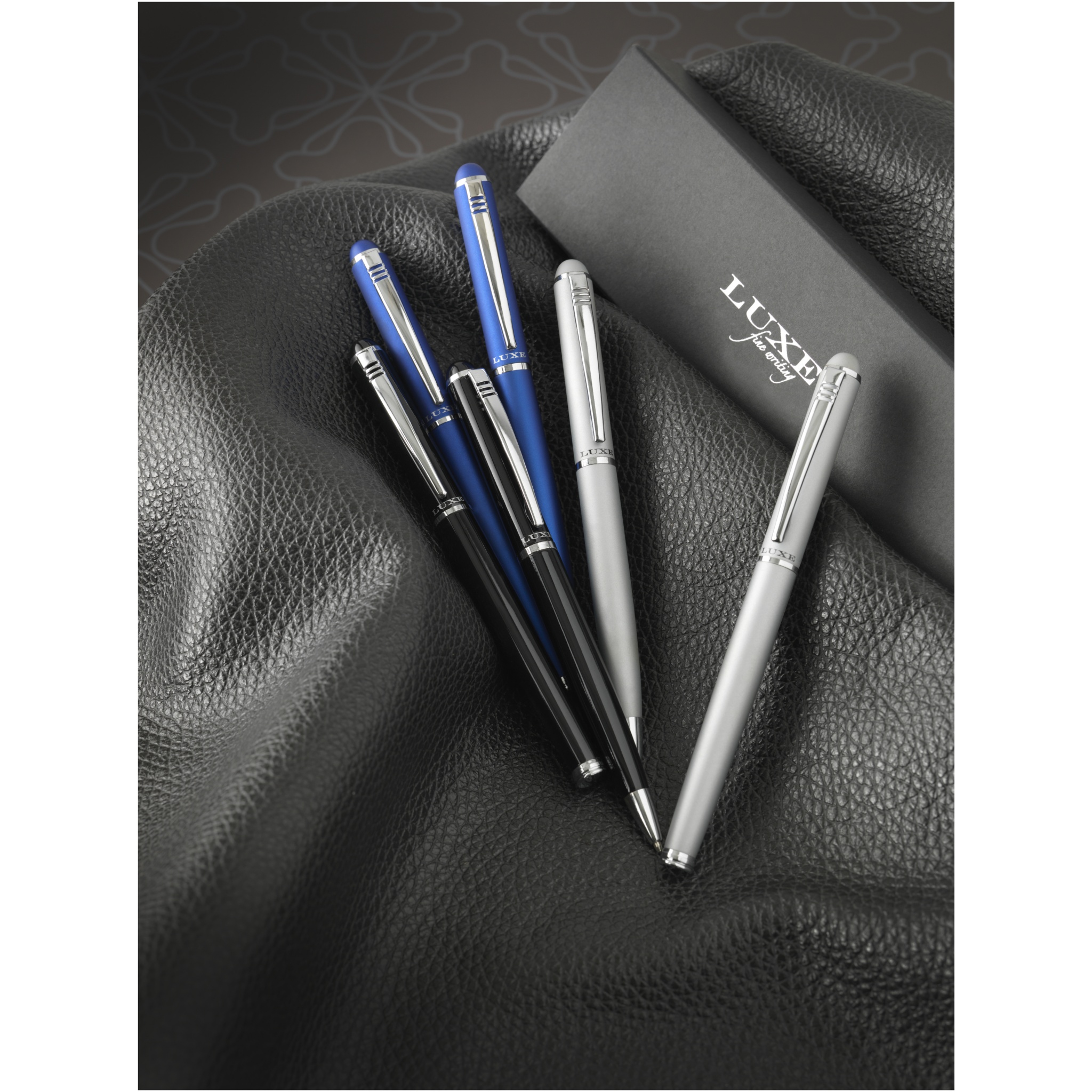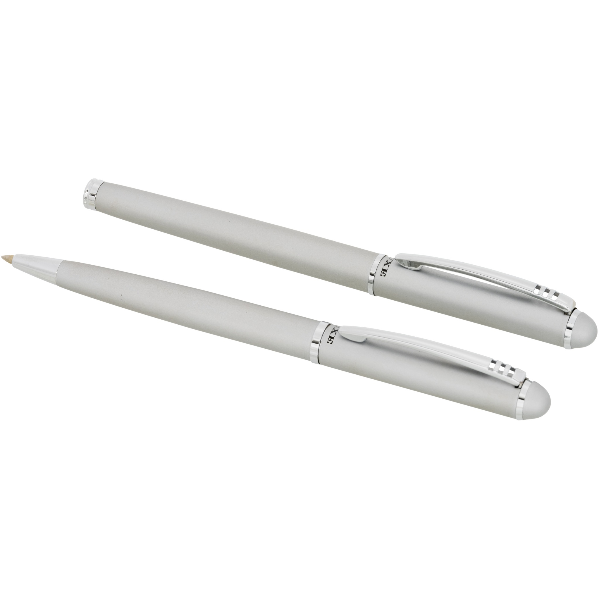 Eksklusiivse disainiga keeratava pastapliiatsi ja korgiga rull-pliiatsi komplekt. Saadaval läikivmust, matt hõbedane ja matt sinine. Pakitud ''LUXE'' kinkekarpi (17x5,5x3cm).