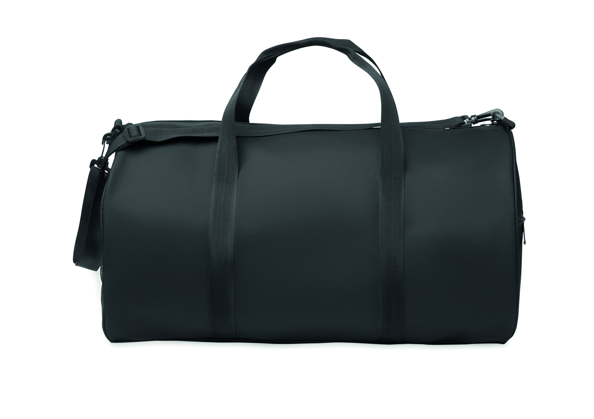 Must 600D RPET polüestrist PU-kattega reisikott. Eesmine lukuga tasku. Sees 210D RPET polüestervooder. 1 küljel lukuga sahtel / 1 küljel võrgust sahtel. Sees lukuga tasku.