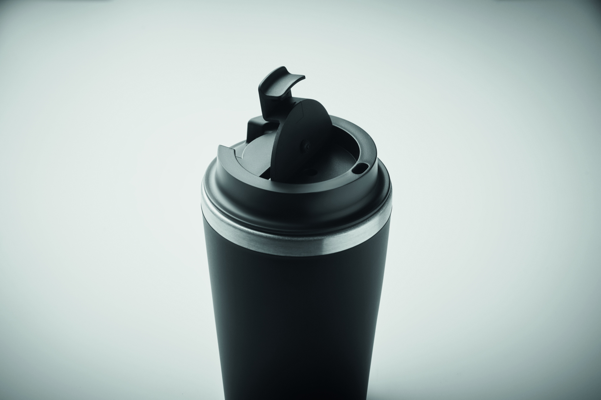Must topelt seinaga PP termoskruus, mille sisesein on taaskasutatud roostevabast terasest (90% taaskasutatud roostevaba teras ja 10% roostevaba teras), keraamilise sisemusega. Lekkevaba. Mahutavus: 350 ml.