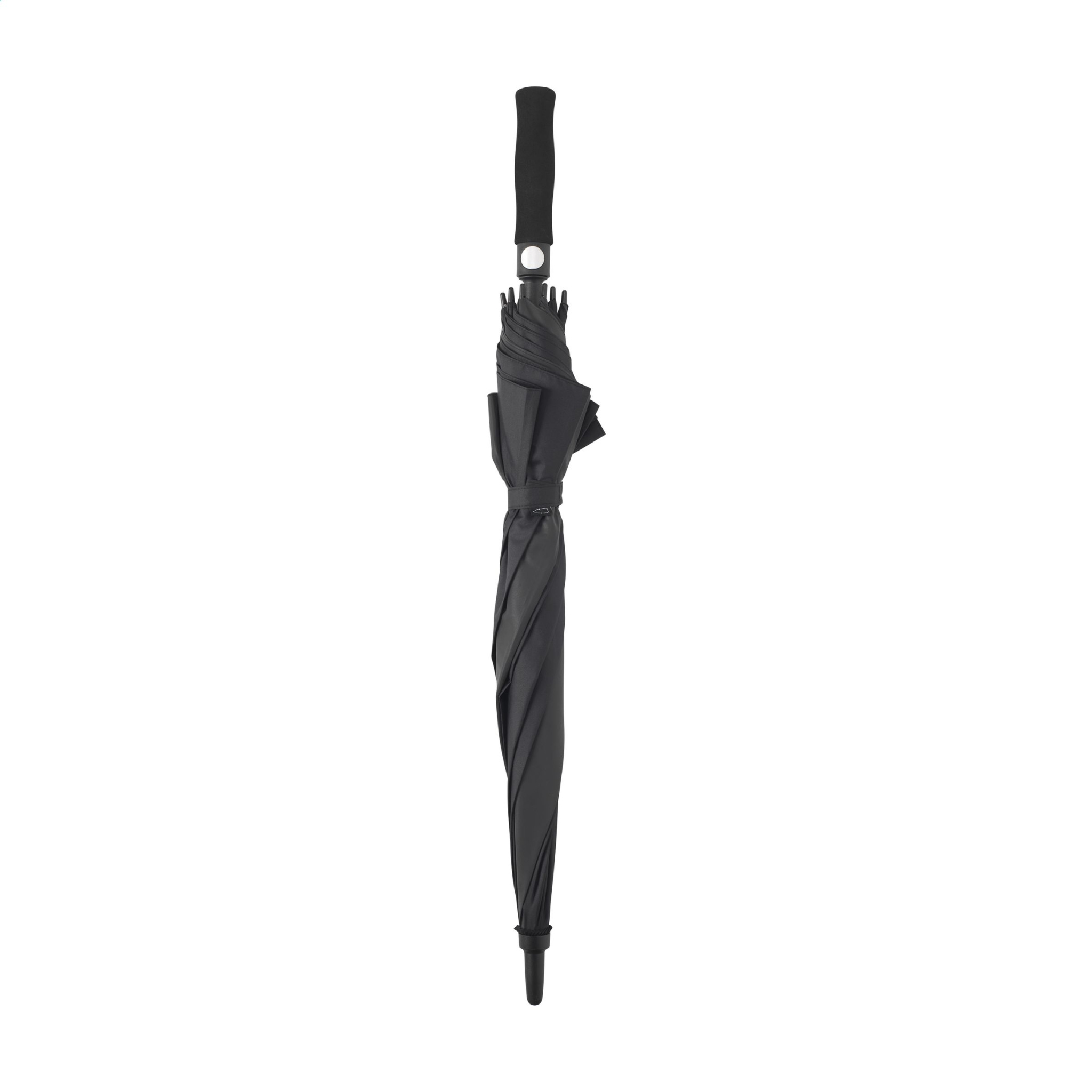 Vau! Vihmavari 190T RPETpongee polüester varikatusega. Sellel vihmavarjul on kaks diskreetset, peegeldavat osa, mis sulanduvad päevavalguses vihmavarju kujundusse. Need peegeldavad osad süttivad valgust püüdes, et muuta kasutaja pimedas nähtavaks. Sellel on automaatne teleskoopvedrustus (automaatne avamine), klaaskiust raam, metallvõll, pehme EVA käepide ja takjakinnisus. RCS-sertifikaadiga. Taaskasutatud materjal kokku: 17%.