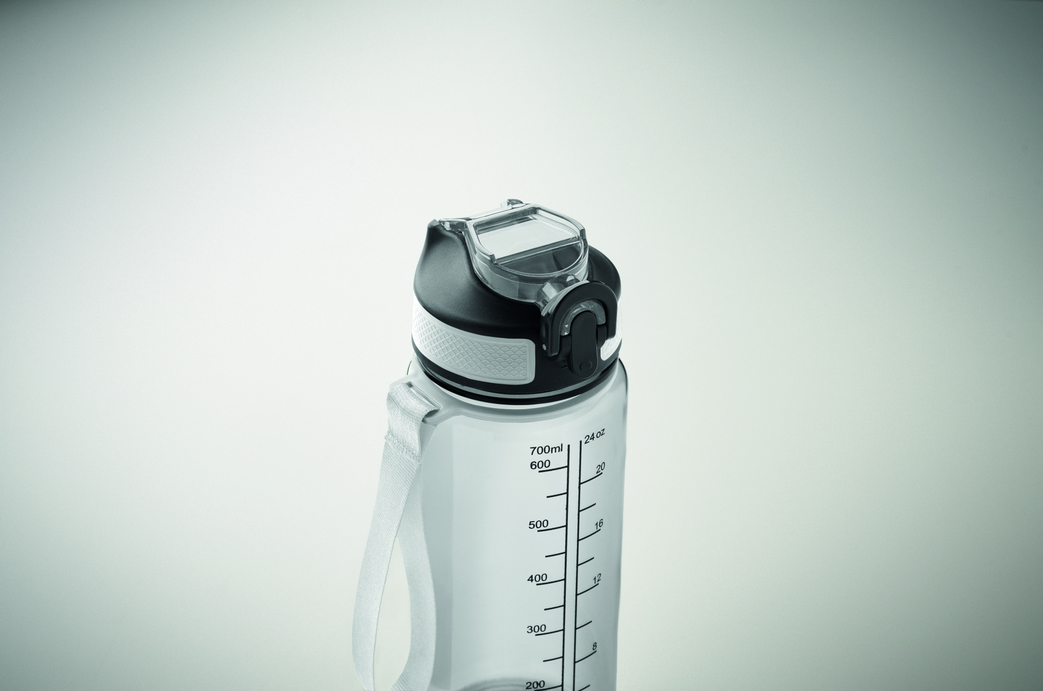 Motiveeriv spordiveepudel RPET-materjalist integreeritud kõrre, pehme silikoonist joogiavaga, ühe käega avatava klapiga kaane ja turvalukuga. RPET-satiinist kanderihmaga. Mahutavus 700 ml. Lekkevaba.