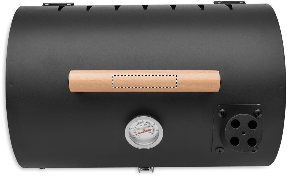 Kaasaskantav rauast grilltünn korstna ja temperatuurinäidikuga. Must tulekamber. Lukustusriiv ja puidust kandesang.