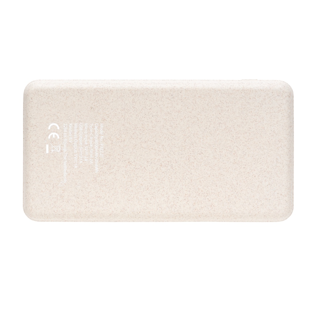 8000 mah juhtmevaba akupank koos 5 W juhtmevaba laadijaga. Pealmine külg on valmistatud naturaalsest korgist ja ümbris on valmistatud 35% ABS-iga segatud nisukõrtest. Sisend on valikuline mikro-USB või C-tüüpi kaudu. Täielikult laetuna annab see piisavalt energiat mobiiltelefoni kuni neli korda laadimiseks. Akupank sisaldab kauakestvat A-klassi 8000 mAh liitiumpolümeerakut. Toiteindikaatorid näitavad järelejäänud energiataset, nii et teate alati, millal laadida. Juhtmeta laadimine ühildub kõigi QI-toega seadmetega, nagu Android uusim põlvkond, iPhone 8, 8S ja X. Mikrosisend 5V/2A Tüüp-C sisend 5V/2A USB-väljund 5V/2.1A. Juhtmeta väljund 5W 5V/1A. Toode ja tarvikud 100% PVC-vaba.