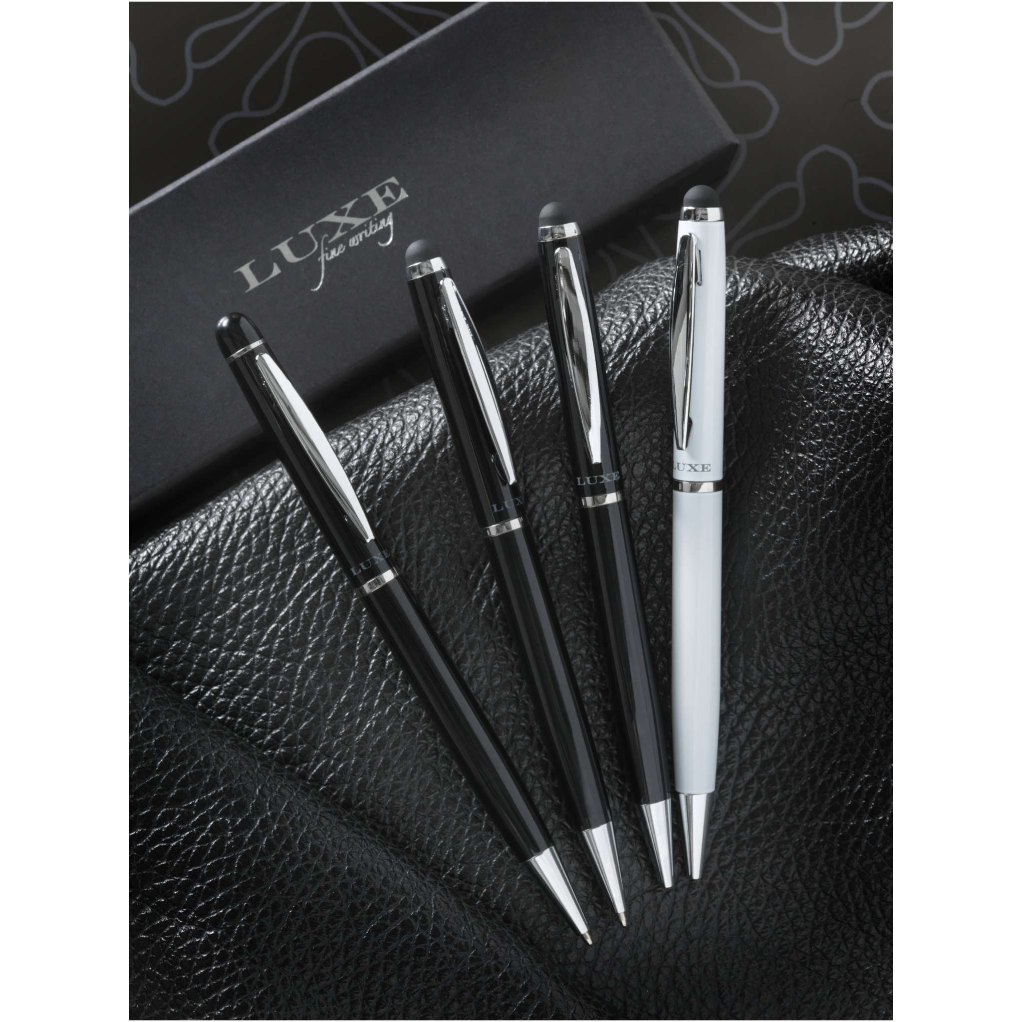 Eksklusiivse disainiga keeratava mehhanismiga pastapliiats sametkotiga. Pakitud ''LUXE'' kinkekarpi (mõõt: 17 x 3,5 x 2 cm).