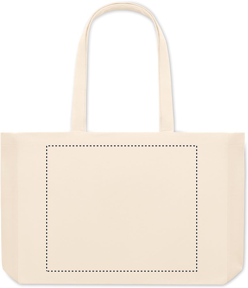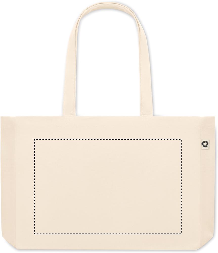 Taaskasutatud lõuendist ostukott või rannakott, 50% puuvill ja 50% taaskasutatud puuvill, pikkade sangade ja servadega. 280 gr/m².
