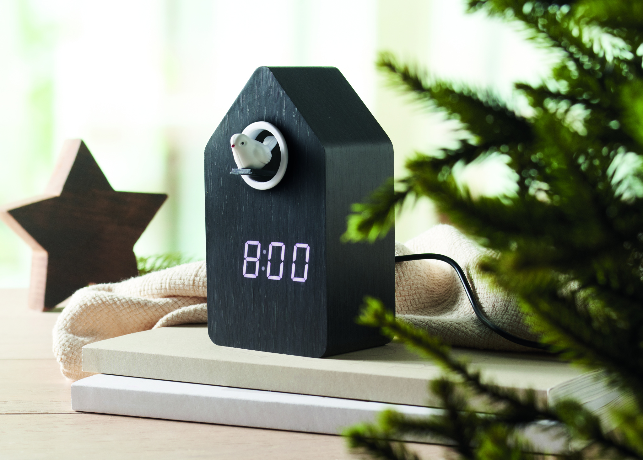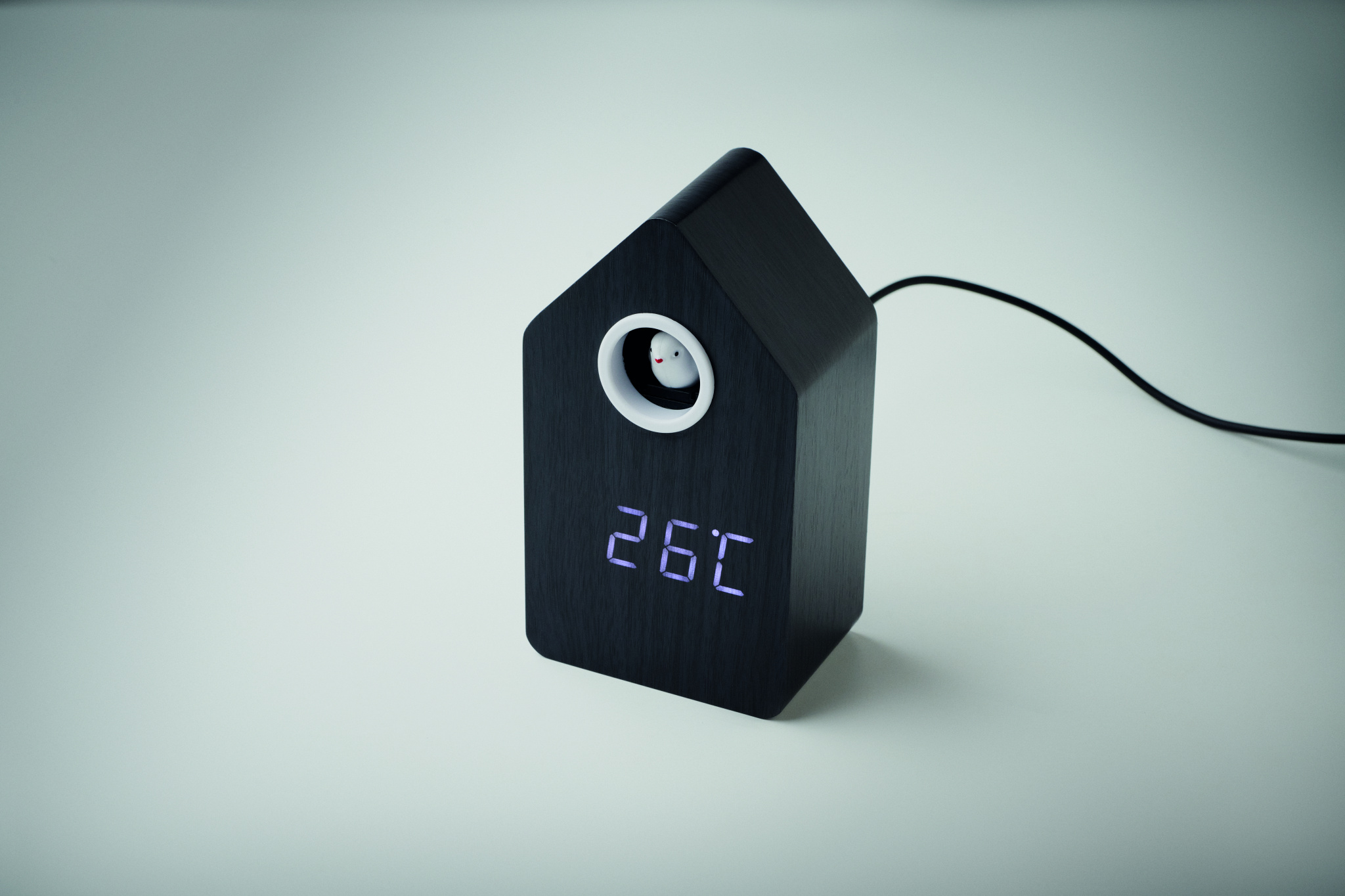 Musta värvi MDF-ist käokell sisseehitatud äratuse/temperatuurinäidikuga. Lind tuleb välja iga täistunni ja äratuse ajal ning sellel on käolinnu hääl. Valge LED-ekraan. Heli vaigistatakse automaatselt kella 22.00 ja 06.00 vahel. 5-minutilised edasilükkamise intervallid.