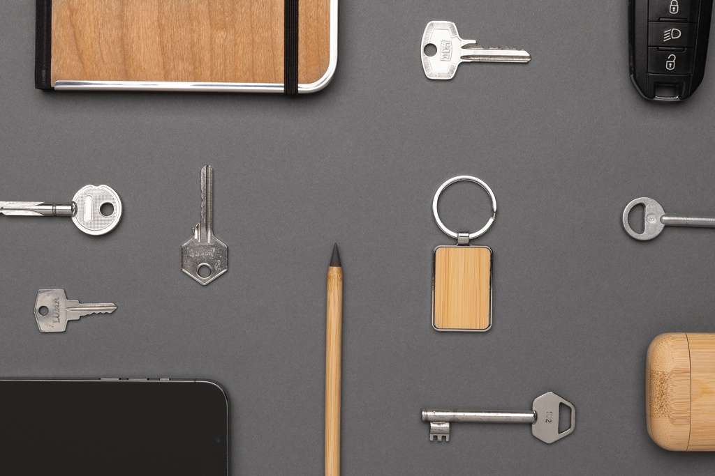 Logotrade meene foto: RCS taaskasutatud tsingisulamist ristkülikukujuline bambusega võtmehoidja