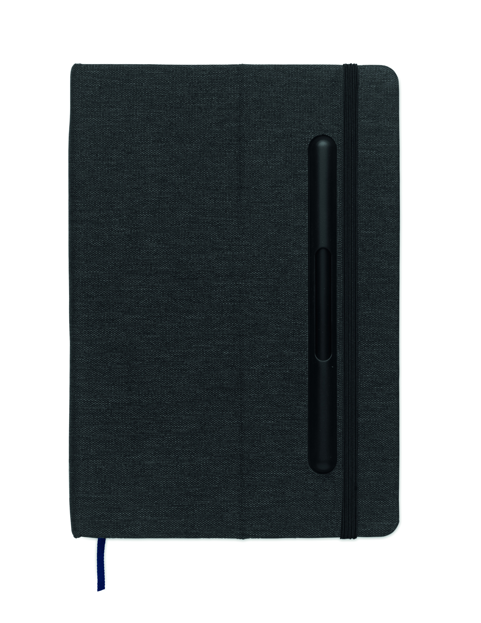 A5 märkmik RPET kõvade kaantega, millel on telefonihoidiku funktsioon. 2-ühes tindivaba ja tavaline ABS- pastapliiats. 192 taaskasutatud paberist lehekülge (96 lehte). Samas toonis kummipaela ja järjehoidjaga.