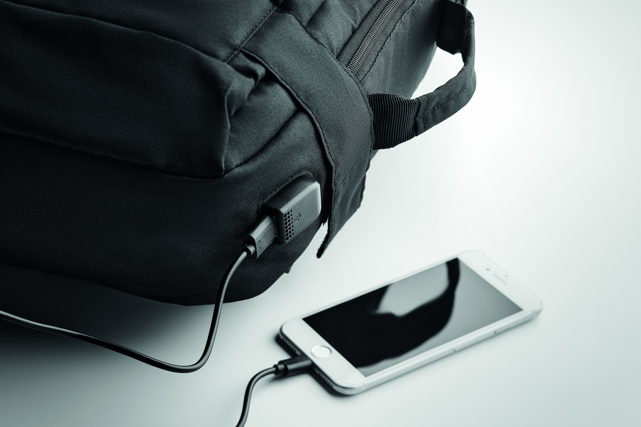 Sülearvuti seljakott 300D RPET polüestrist polsterdatud õlarihmaga, mis sisaldab ühte peamist sisemist sahtlit 16-tollise sülearvuti jaoks ja USB-laadimiskaablit.