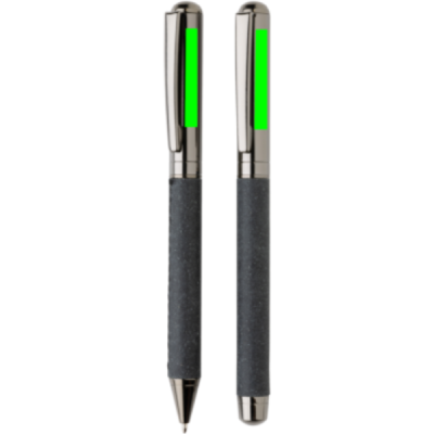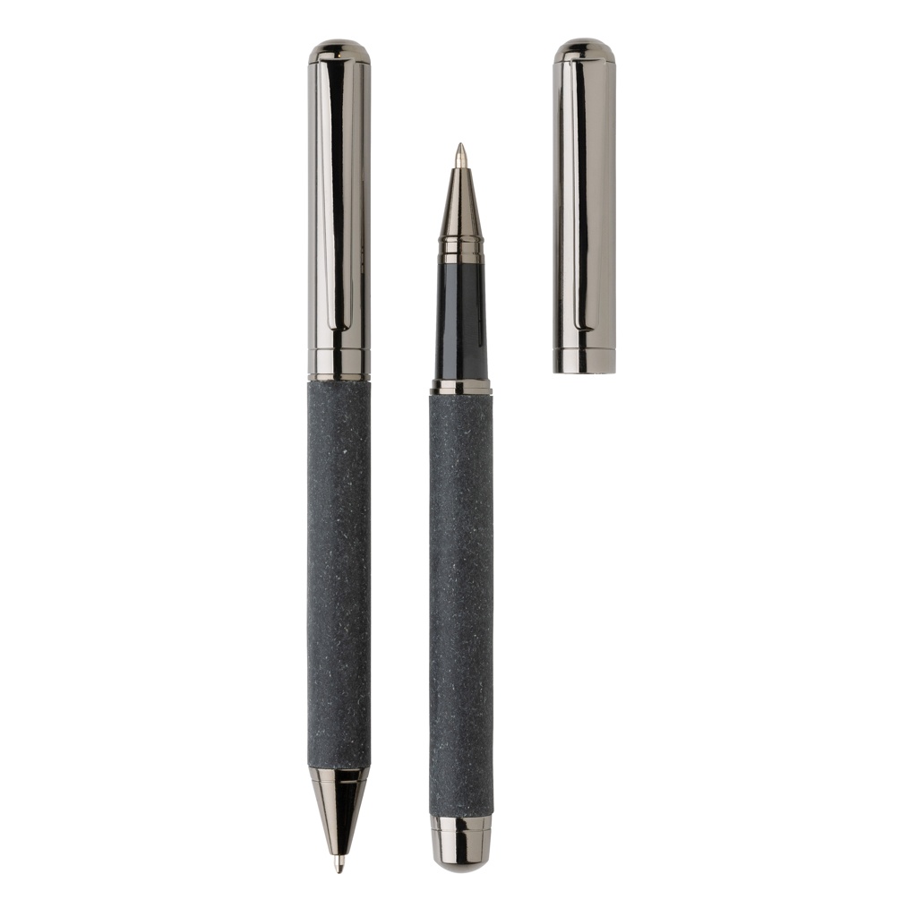 See kaunis pliiatsikomplekt on valmistatud taaskasutatud nahast. Komplektil on elegantne gunmetal värviline disain, stiilne ja ideaalne oma märkmete stiilseks kirjutamiseks. See sisaldab kuulipalli ja rullpalli. Iga pliiats sisaldab sinist dokumentaaltinti. Pliiatsi kirjutuspikkus on 1200 meetrit ja rullpalli 400 meetrit. Pliiatsikomplekt on taaskasutatud nahast kotis ja kinkekarbis, millel on taaskasutatud nahast muster.