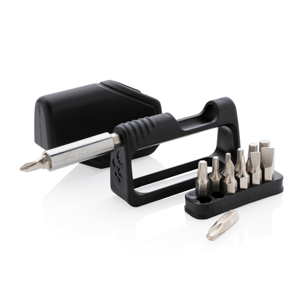 Lihtne kaasas kanda 12 otsaku ja ühe 2-tollise roostevabast terasest pikendiga komplekt. ABS korpus integreeritud hoidikuga otsikute jaoks. Komplektis bitid: 3 x TORX draiver (10, 15, 25) 3 x kuuskantjuht (3 mm, 4 mm, 5 mm), 3 x Philipsi draiverid (1,8 mm, #0 #2) 3 x lamedad draiverid (1,8 mm, #3 #) 5) Vööklambriga vöö või tasku külge kinnitamiseks
