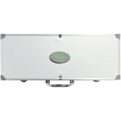 12 kpl ruostumaton BBQ-setti, sisältää 4 paistohaarukkaa, lihaveitsen, 4 maissintähkänpidintä, paistolastan, lihahaarukan suojuksella ja paistopihdit. Pakattu alumiinilaatikkoon, saranat ja kahva.