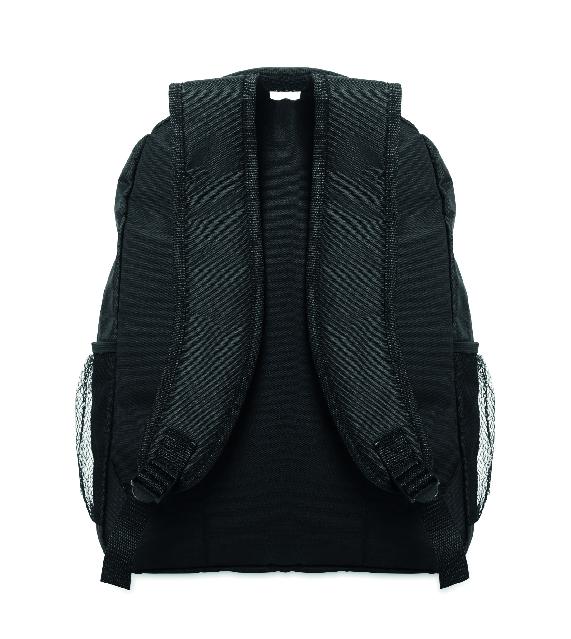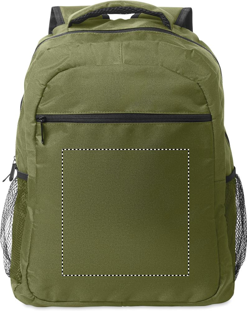Kannettavan tietokoneen reppu 15 tuumaa 600D RPET-polyesteriä, pehmustettu kannettavan tietokoneen lokero sisällä, verkkotaskut molemmilla puolilla ja vetoketjullinen etutasku.