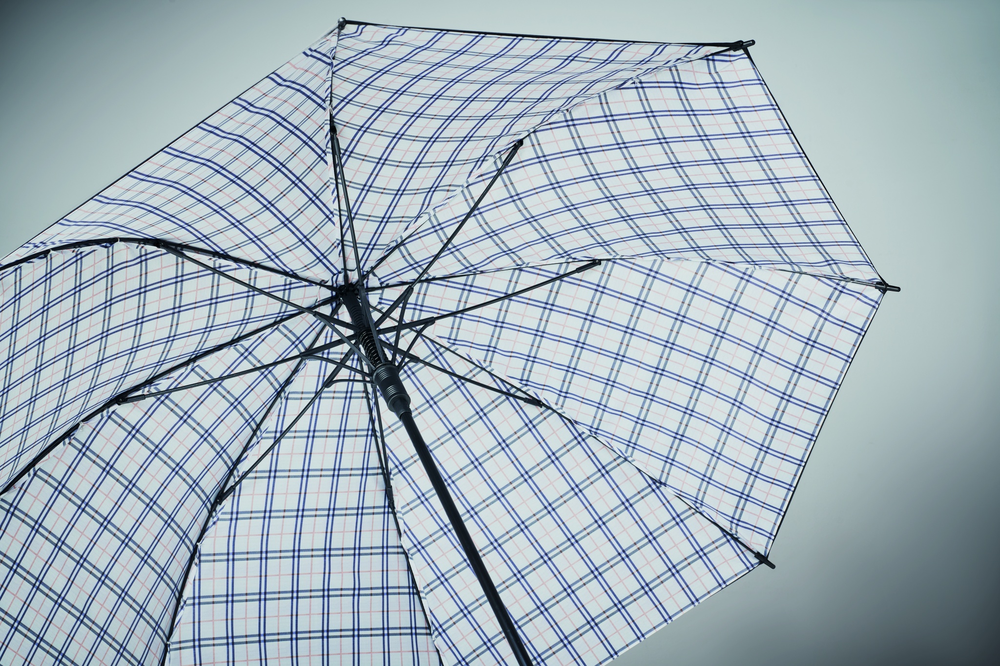 23 tuuman automaattiaukaisulla oleva tuulenpitävä sateenvarjo 190T pongeesta, jossa on ruutukuvio. Lasikuiturunko, jossa on mustaksi pinnoitettu varsi ja muoviset kärjet. Kaareva kumipäällysteinen kahva. Manuaalinen sulkeminen.