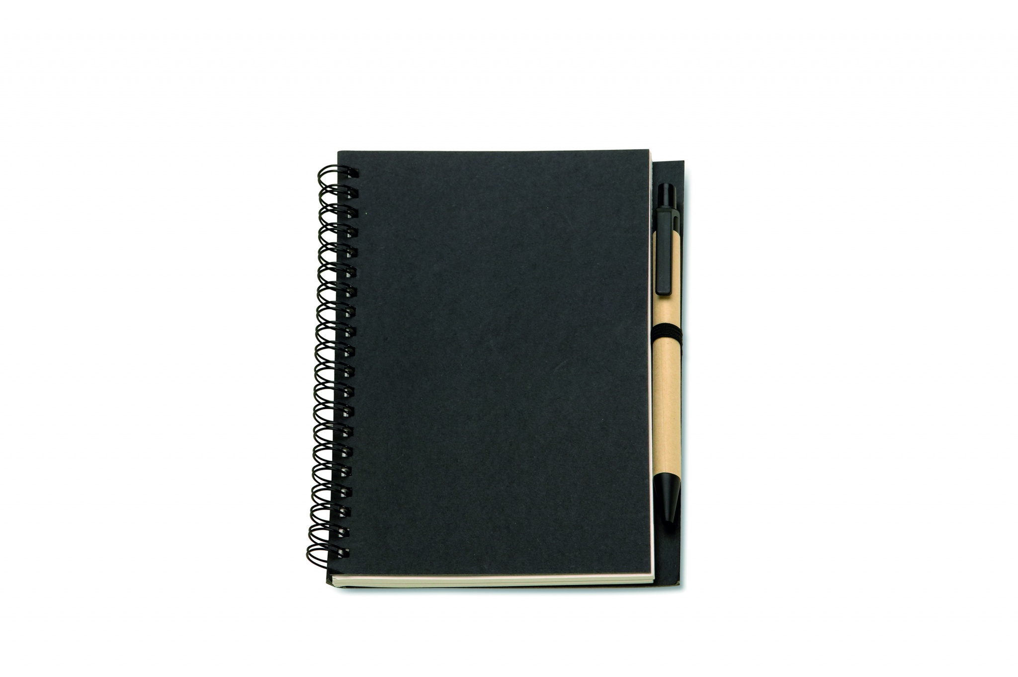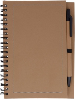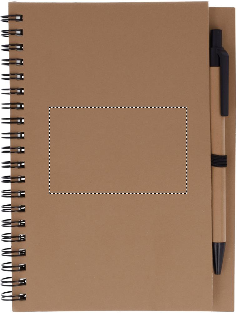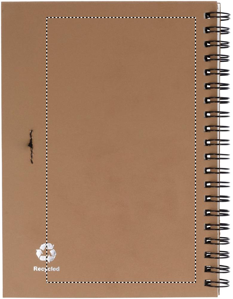 Kierrätetty muistikirja, mustalla tai luonnonruskealla kannella. Sisältää 120 sivua kierrätyspaperia (70 arkkia) ja biohajoavan kierrätetyn kuulakärkikynän sinisellä musteella.