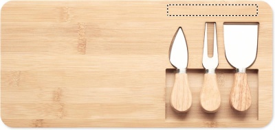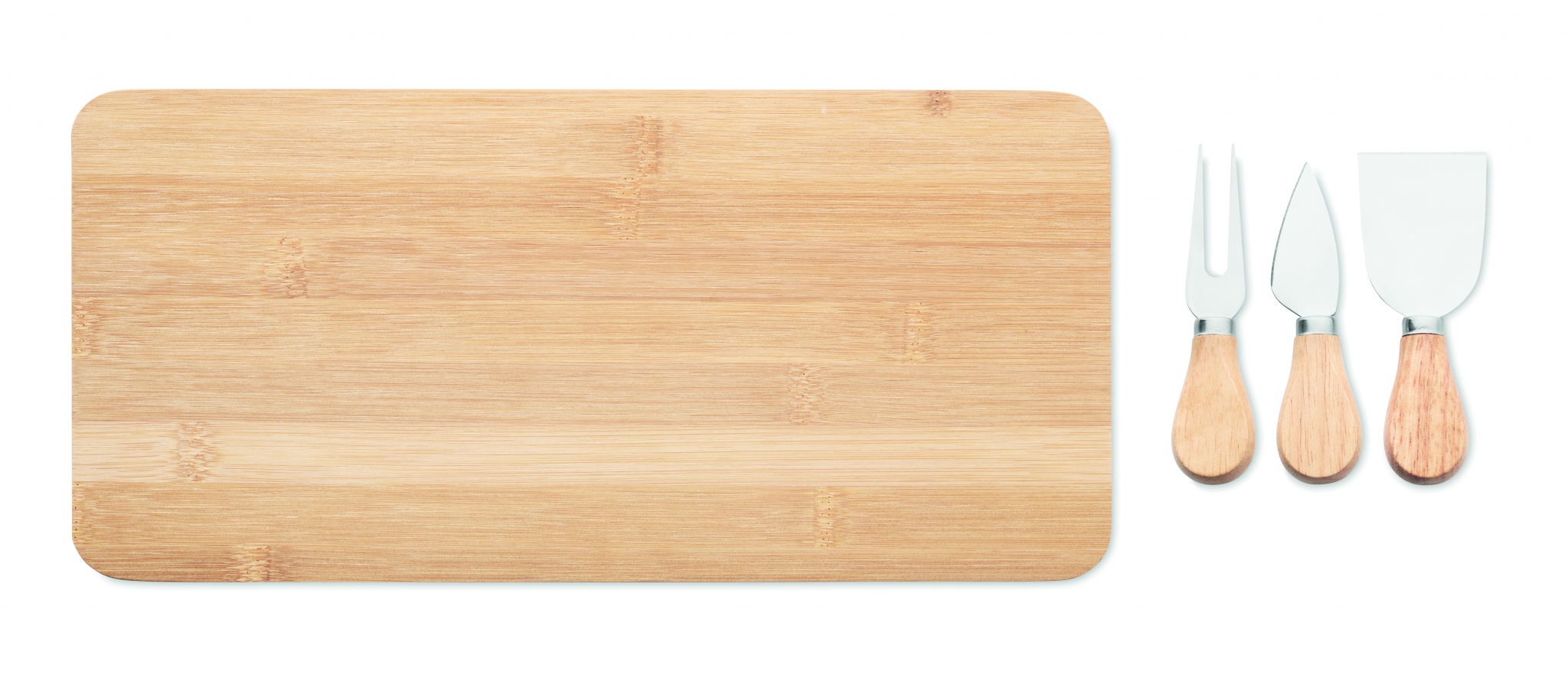 Bambuinen juustolauta, sisältää 2 erilaista juustoveistä ja tarjoiluveitsen. Luonnollisen materiaalin (bambu) vuoksi, tuotteiden värissä/ koossa saattaa olla erinäisyyksiä ja tämä voi vaikuttaa painatuksen lopputulokseen.