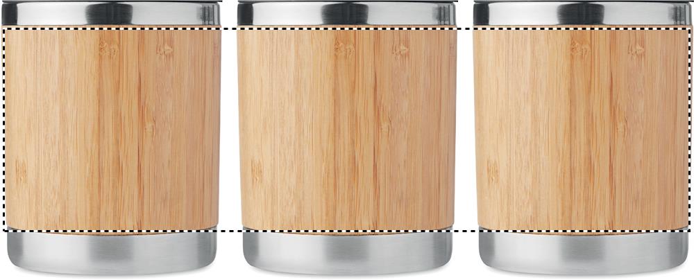 Kaksiseinäinen ruostumattomasta teräksestä valmistettu 250 ml take away muki, bambu kuorella. Luonnollisen materiaalin (bambu) vuoksi, tuotteiden värissä/ koossa saattaa olla erinäisyyksiä ja tämä voi vaikuttaa painatuksen lopputulokseen.