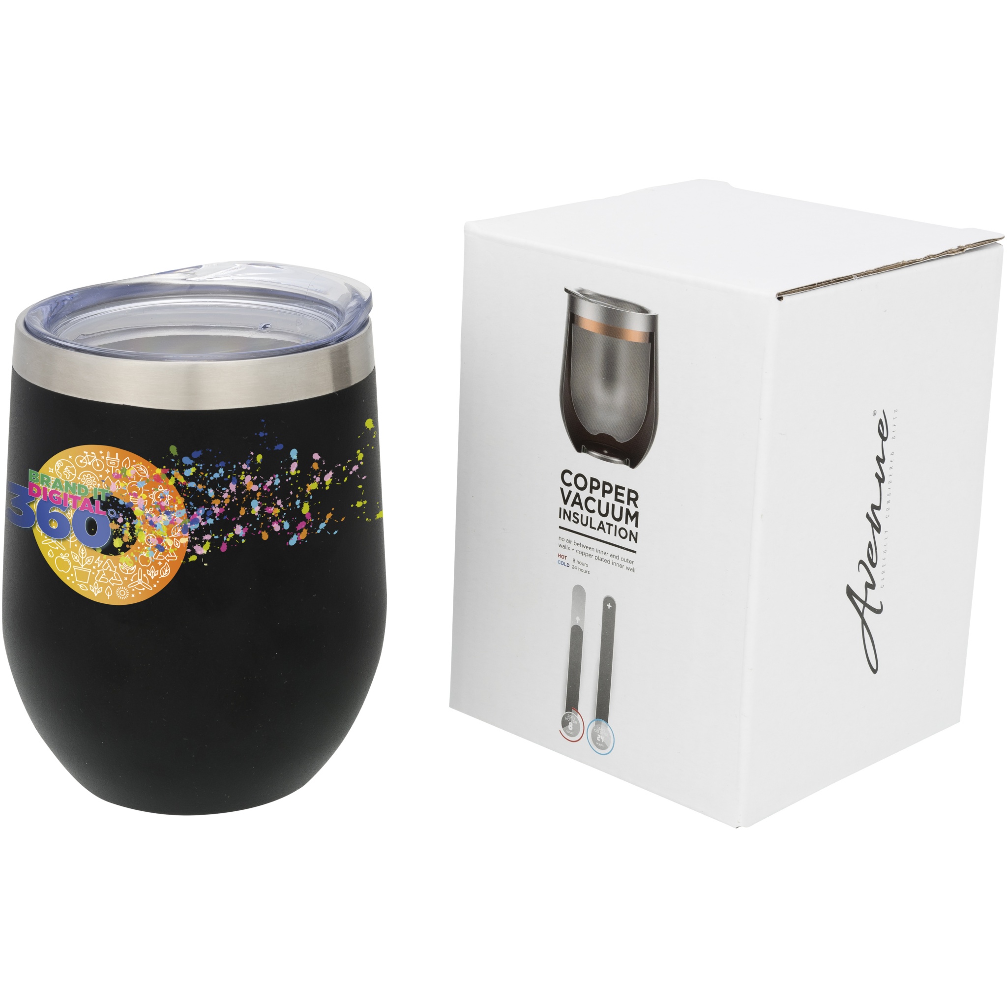 Corzo kuparityhjiöllä eristetyssä mukissä on kaksinkertaisen seinän tyhjiörakenne kuparieristyksellä, mikä tarkoittaa sitä, että se pitää juomat kuumana 6 tuntia ja kylmänä 24 tuntia. Rakenne estää mukin ulkopuolen kondensoitumisen. Helppoa juoda, push-on kansi. Mukin ulkopuoli on hiekkapuhallettu. Leveä aukko helppoon täyttämiseen ja kaatamiseen. Tilavuus on 350 ml. Esillepano Avenue-lahjapakkauksessa.
