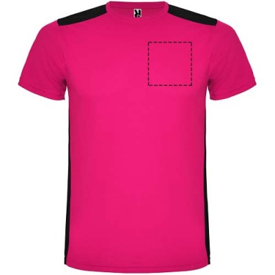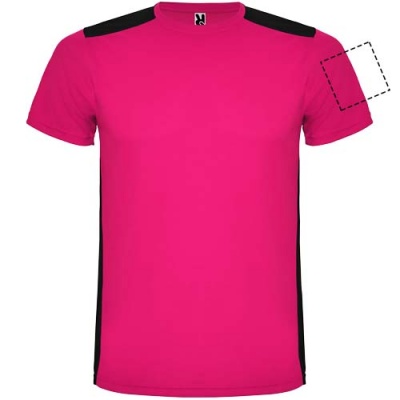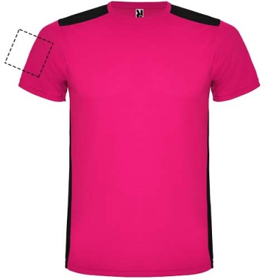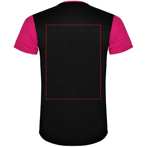 Helposti kuivuva, tekninen ja hengittävä kangas. Pyöreä kaula-aukko. Kahden polyesterikankaan yhdistelmä selässä ja olkapäissä. Bird's eye -kangas edessä ja hengittävä 3D-verkkokangas takana. Kangas, joka on suunniteltu imemään kosteutta. Sivuilla ja olkapäillä koristeellinen siksak-tikki. Selkäosa hieman pidempi. Irrotettava etiketti.