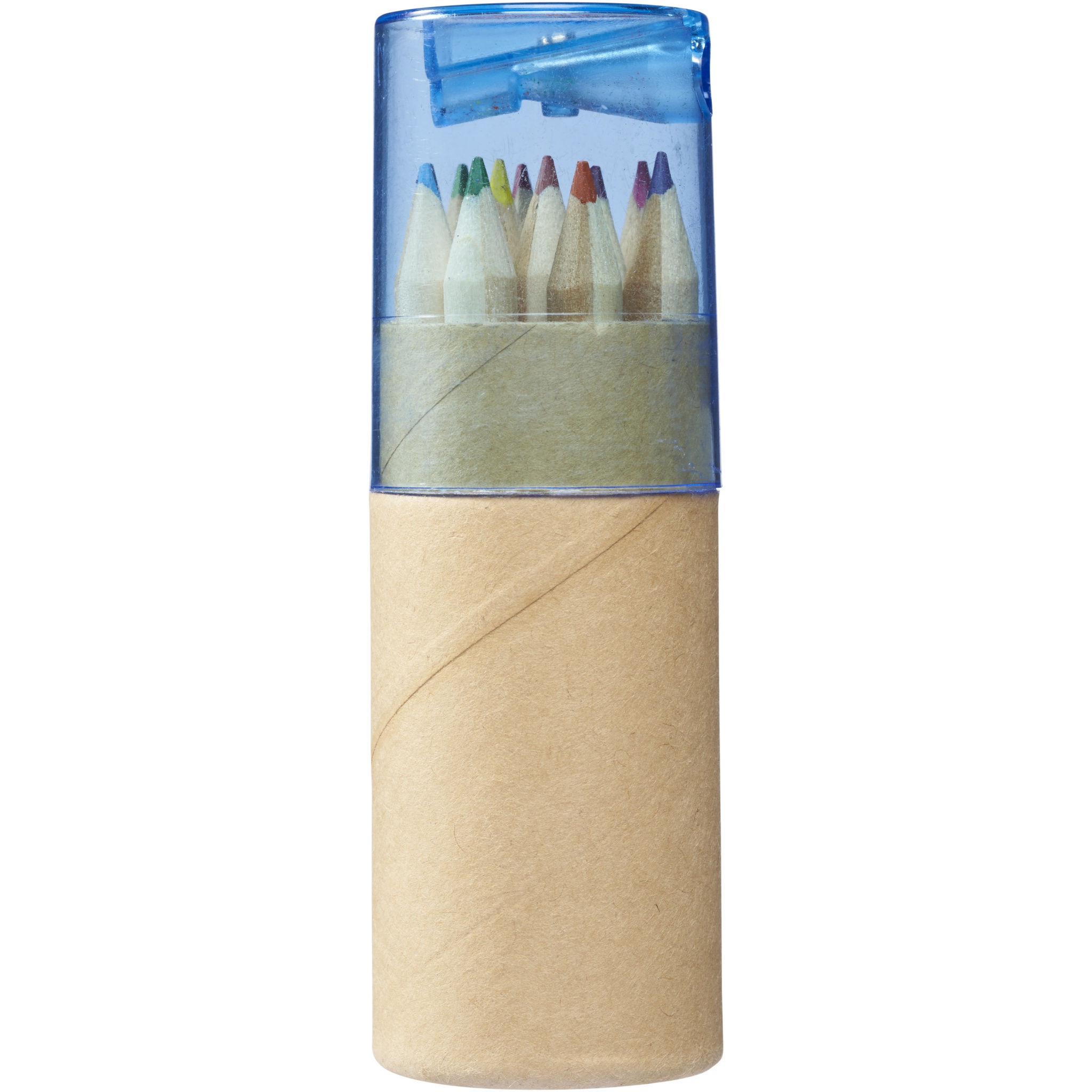 12 värikästä kynää pahvipakkauksessa sekä teroitin muovikannessa. Yksittäisiä osia ei voida merkata.