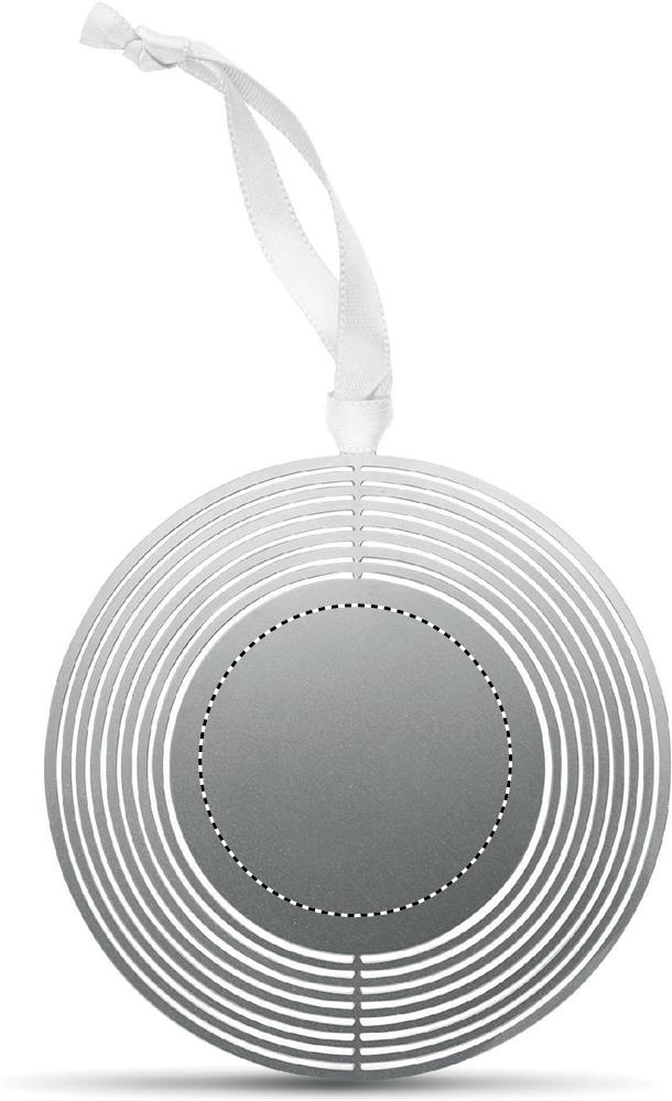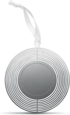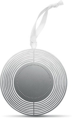 Ruostumattomasta teräksestä valmistettu ympyrän muotoinen koriste, nauhalla. Pakattuna lahjakuoreen, helppo lähettää postissa litteän muodon vuoksi.