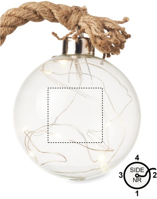 Lasinen joulupallo juuttinarulla ja 8 lämpimällä LED-valolla. 2 AA patteria ei sisälly toimitukseen.