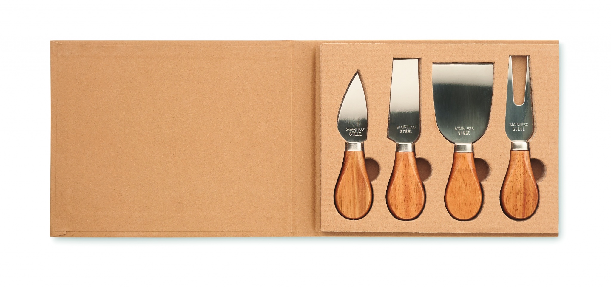 4 juustoveitsen setti, ruostumatonta terästä ja kumipuinen kahva.Lahjapakkaus aaltopahvipakkauksessa