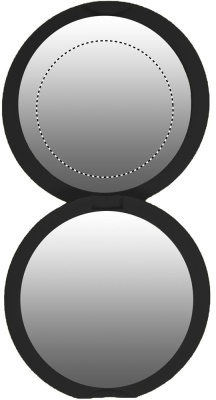 Kumisella pinnalla varustettu kaksipuoleinen käsipeili, suurentavalla ja vakiopeilillä.