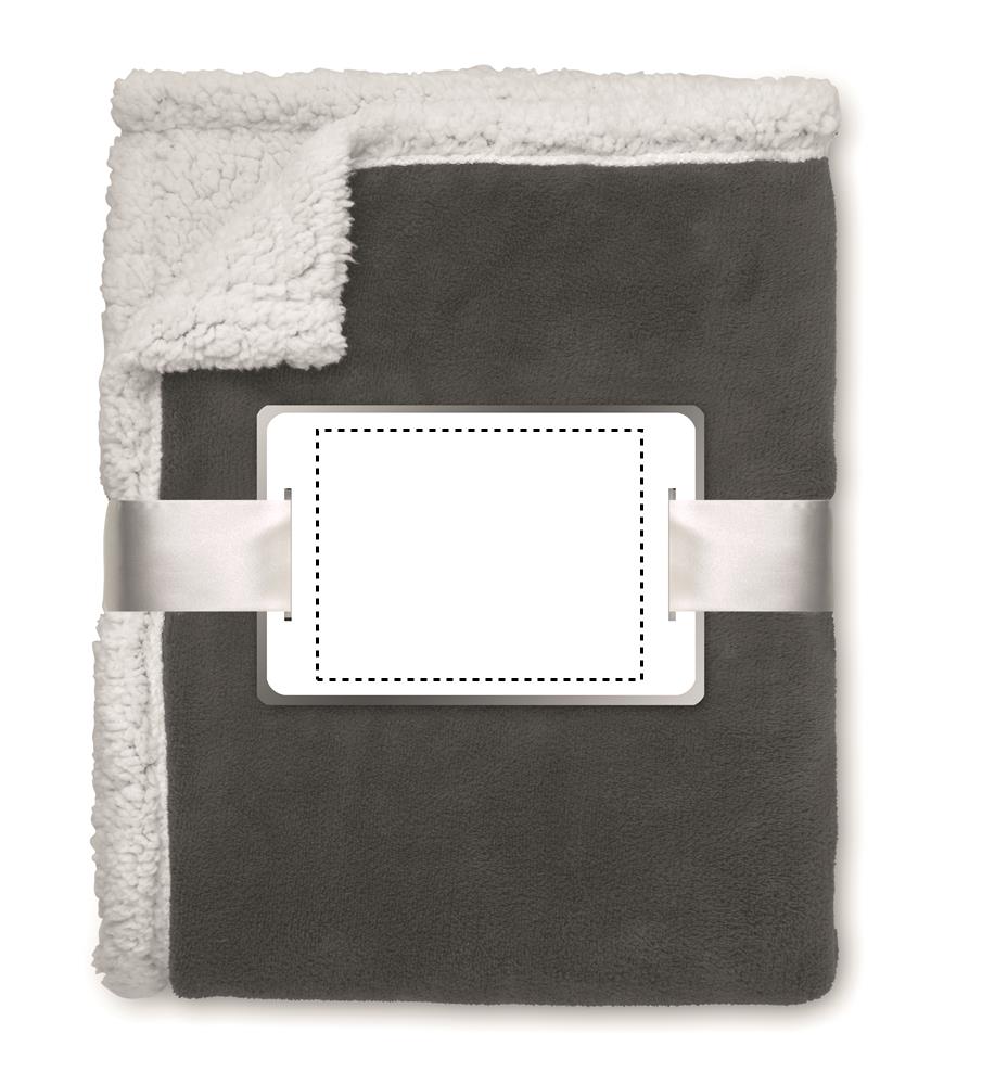 200 g/m² korallifleece viltti, käännettävä 220 gr/m² polyesteriserpa-vuori. Käärittynä nauhaan, nauhan päällä painettava kortti.