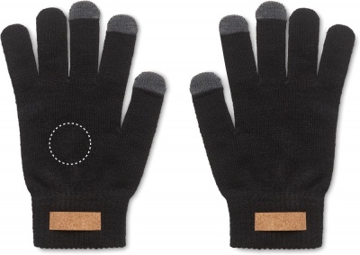 Älypuhelimen kosketusnäyttökäsineet RPET-polyesteriä. Käsineissä on korkkia oleva merkki merkkausta varten.