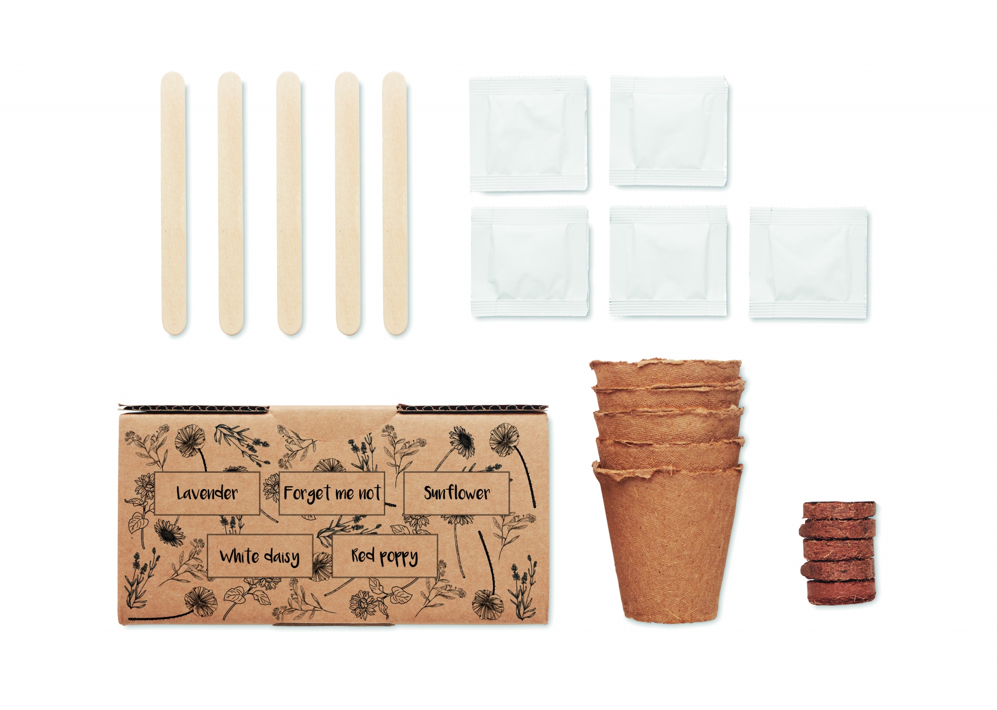 Kukkien kasvatus sarja, sisältää laventelin, lemmenkukan, auringonkukan, päivänkakkaran ja unikon siemeniä. Eurooppa tuotantoa. Sisältää turvenapin.