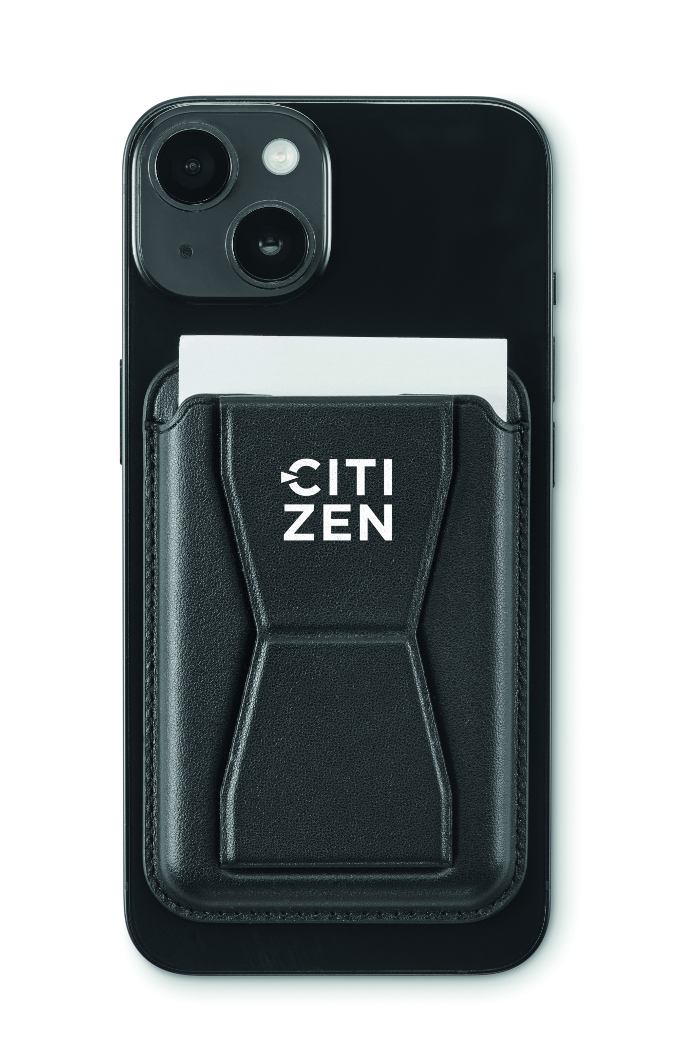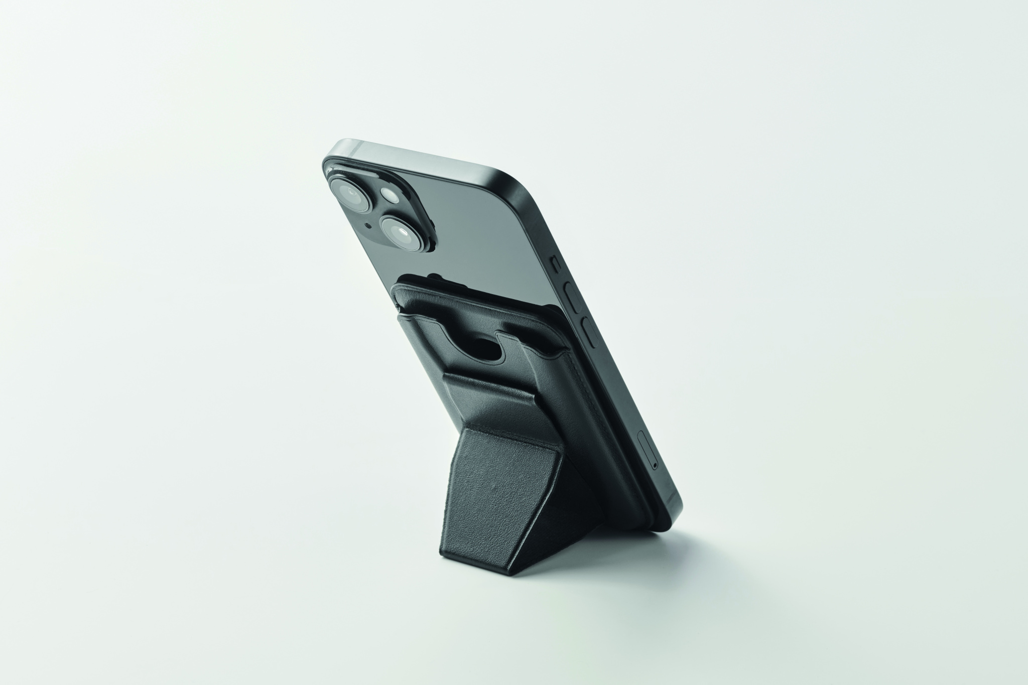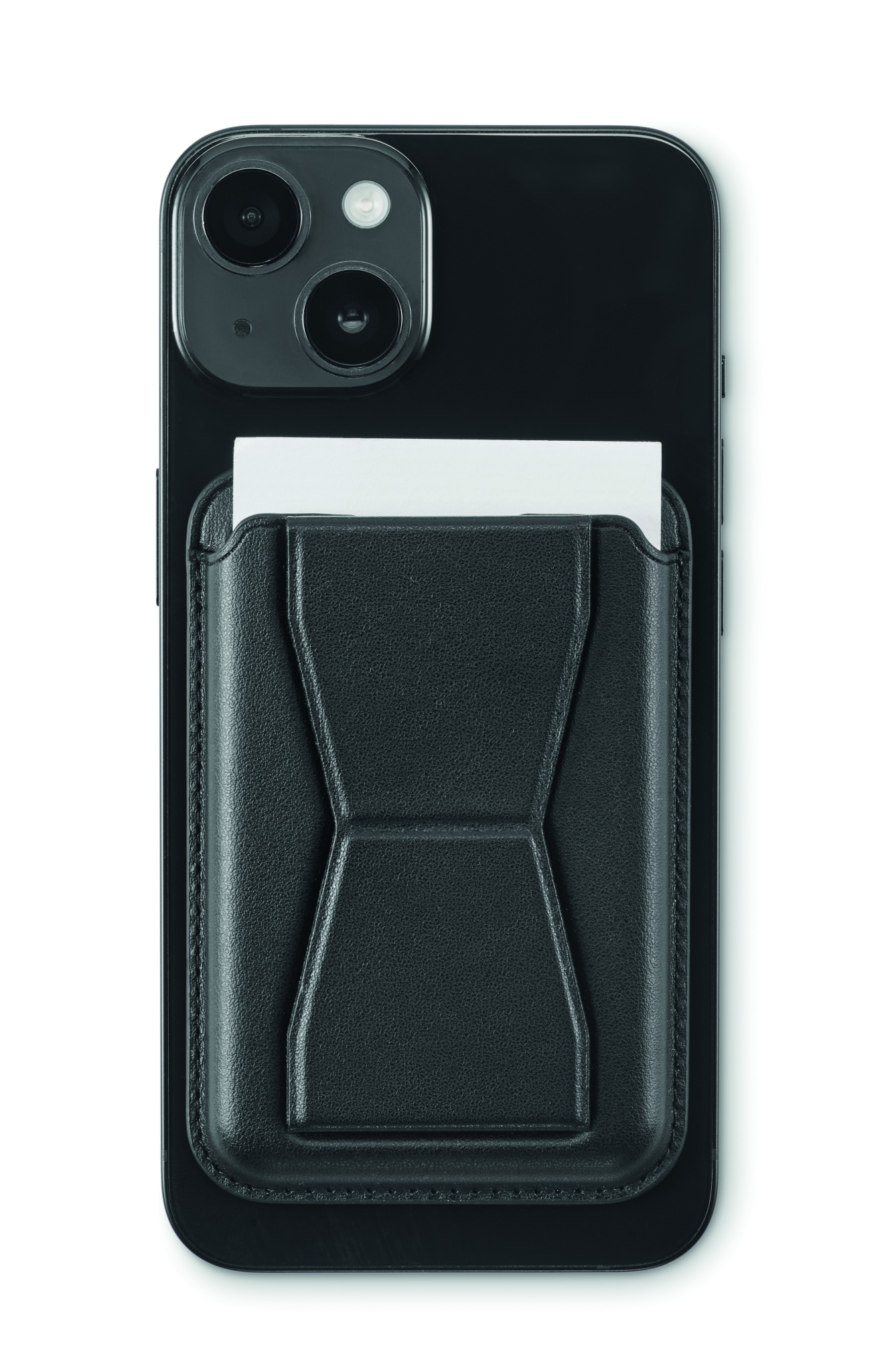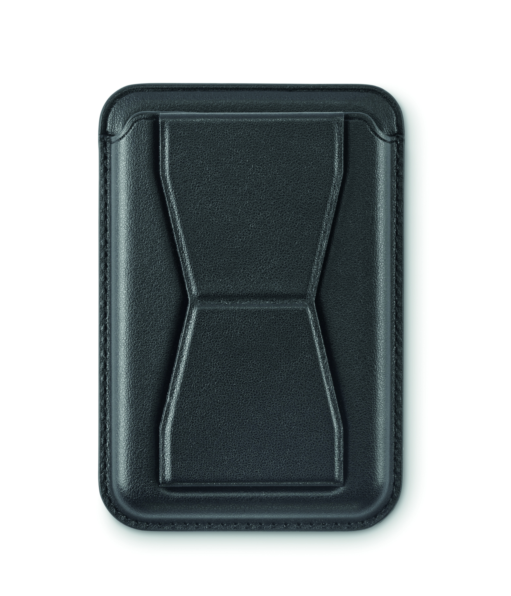 PU-nahkainen puhelinkorttiteline (kahdelle kortille), jossa telinetoiminto ja magneettinen suljin. Yhteensopiva iPhone® 12:n ja uudempien kanssa. Mukana magneettinen metallirengas muiden ei-magneettisten langattomien ladattavien puhelimien lataamiseen.