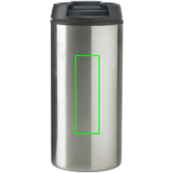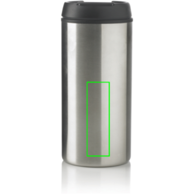 300 ml juomamuki, ulkopuoli ruostumatonta terästä ja sisäpuoli PP, musta sulkumekanismi. Rekisteröity design®