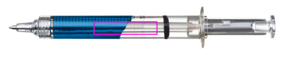 Ruiskun muotoinen kynä, jossa sininen tai punainen muovinen kirjoitustäyttö. Painamme logosi mustalla, vastapäätä mittakaavaa.