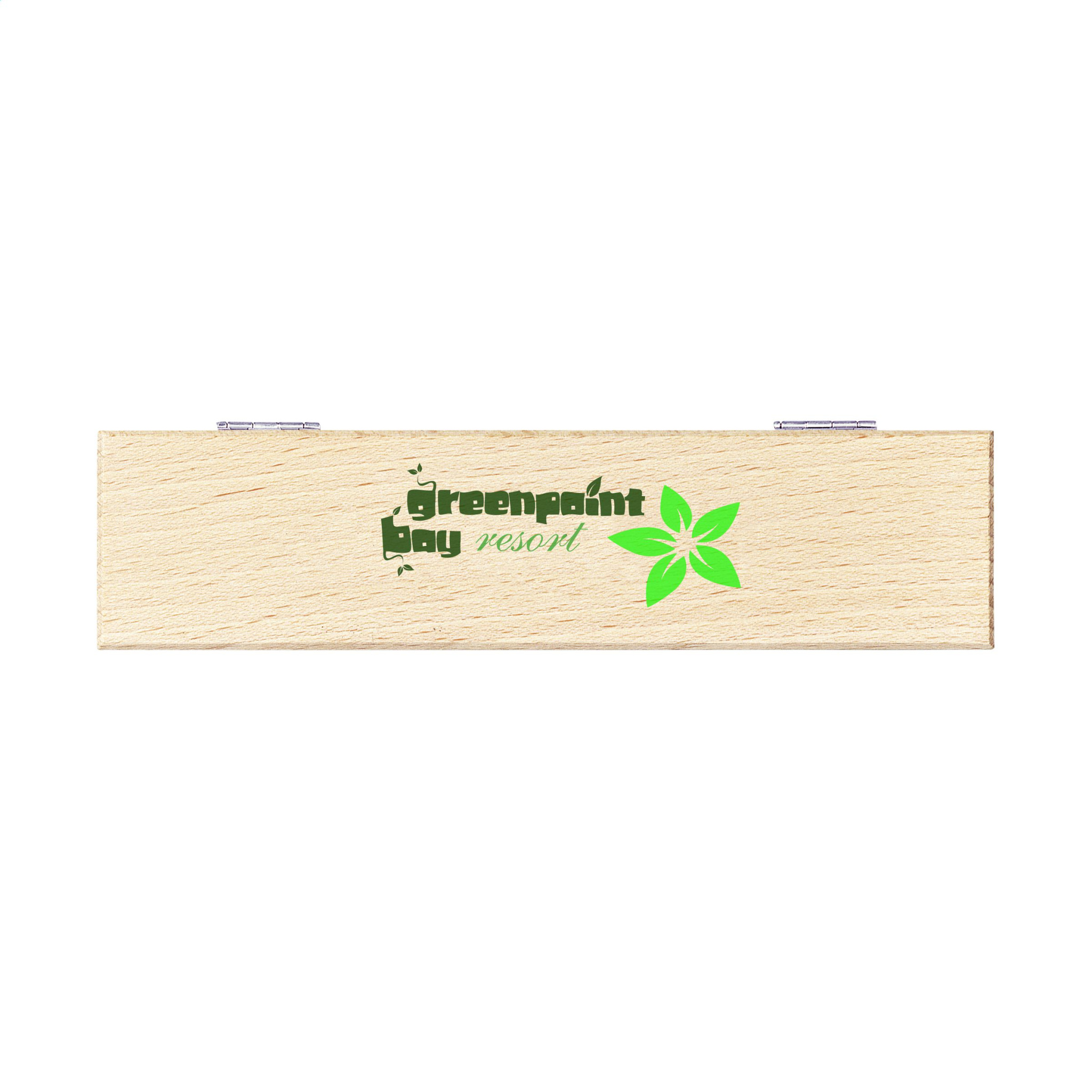 Vau! Pyökkipuinen kirjoitussetti: sinisellä musteella kuulakärkikynä ja täytettävä kynä, jossa on 3 HB-täyttöä (0,5 mm). Kromipidike, painopainike ja kärki. Rantapuukotelossa.
