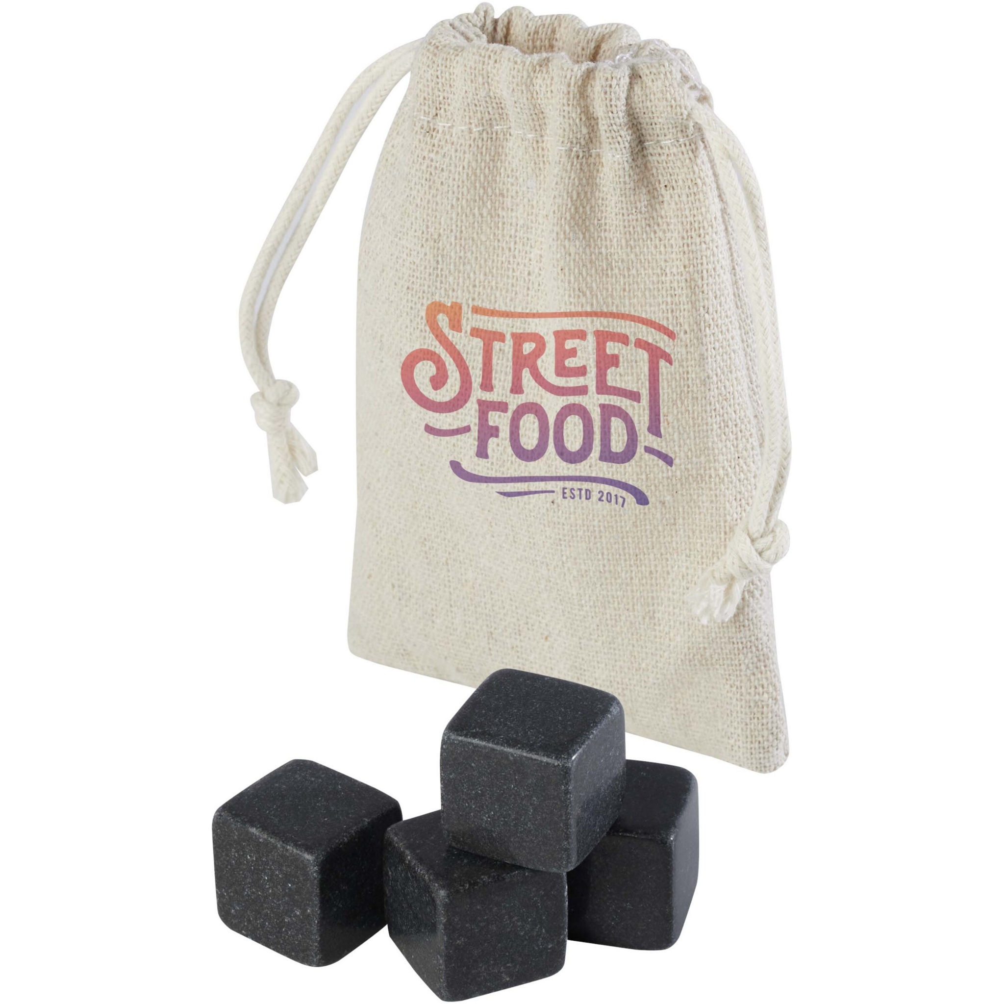Neljän uudelleenkäytettävän kivijääkuution setti toimitetaan pellavapussissa. Nämä kuutiot jäähdyttävät juomat nopeasti ja tehokkaasti säilyttäen samalla maun.