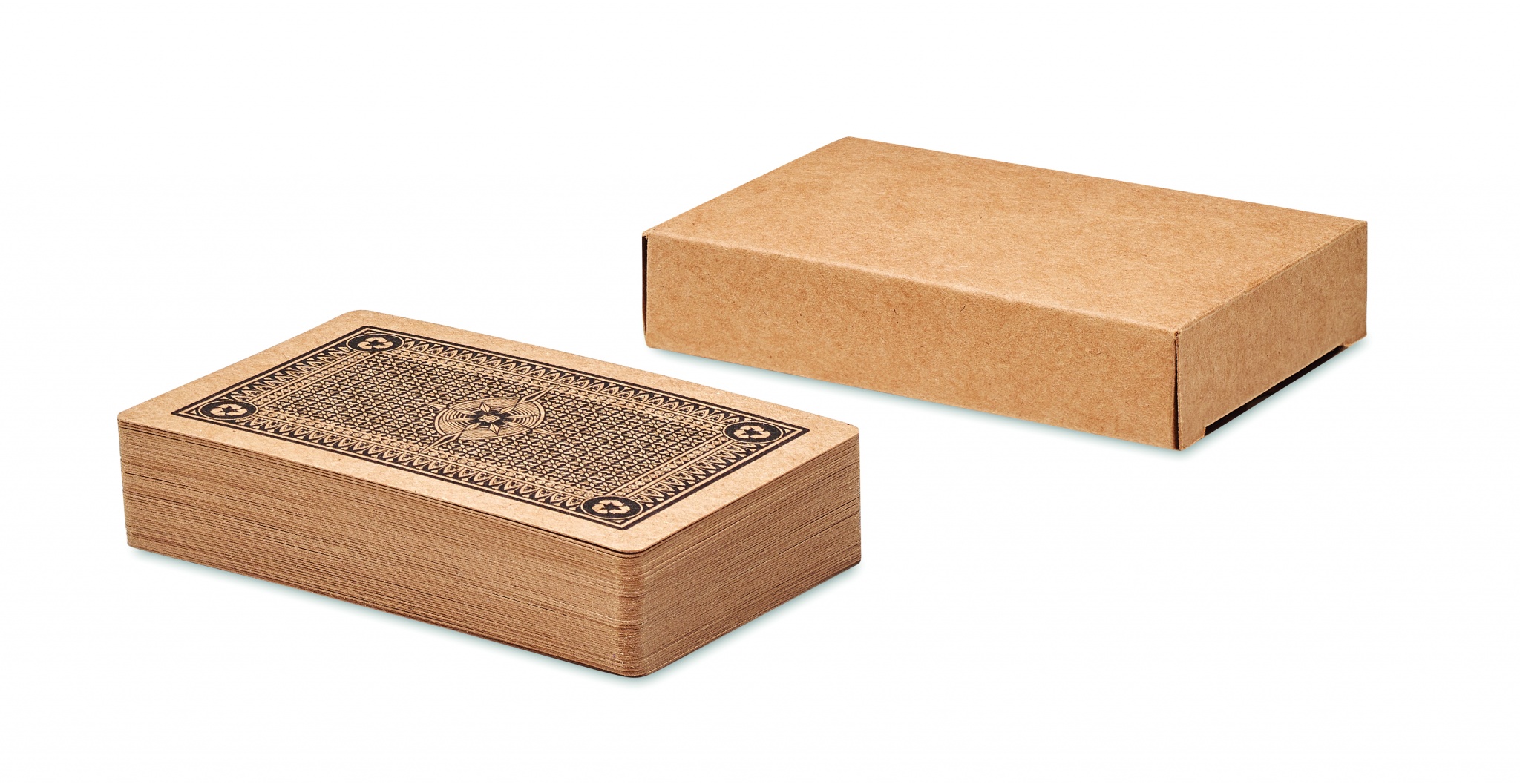 Kierrätetyt pelikortit paperisessa laatikossa, 54 pelikorttia.